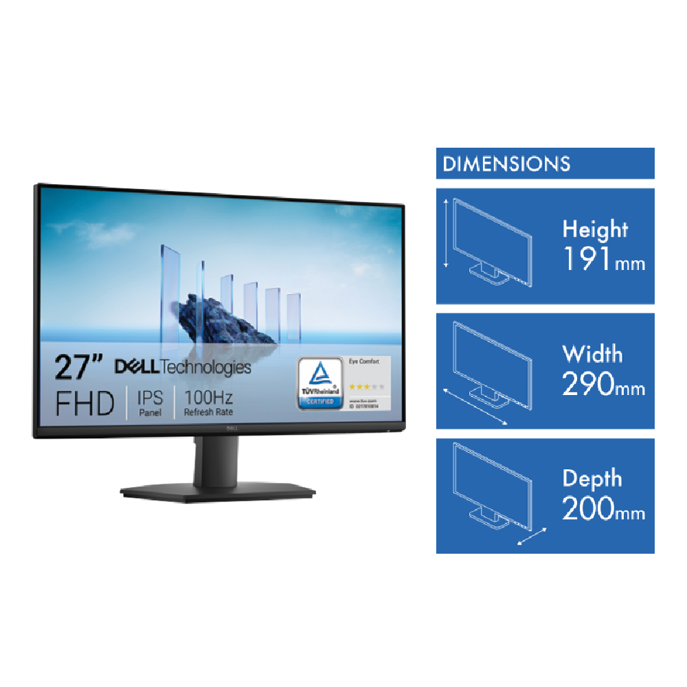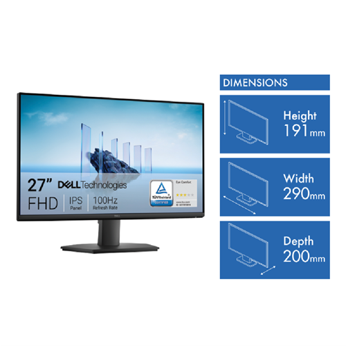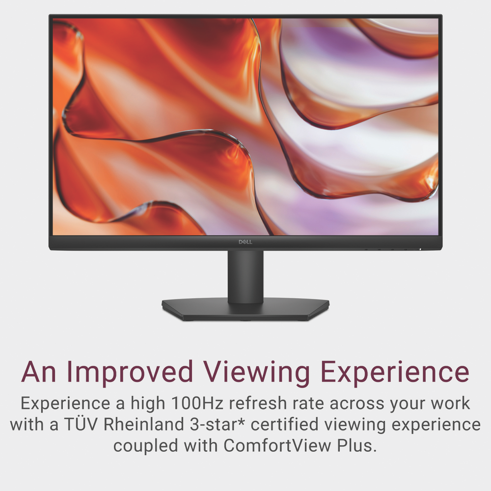 This 27 FHD IPS monitor gives you a clear vibrant view of all your content with its Full HD 1920 x 1080 resolution display. The 100Hz refresh rate makes scrolling and motion look smoother while the 5ms response time keeps up with fast-paced action. ComfortView Plus technology reduces harmful blue light without sacrificing color accuracy making those long work sessions easier on your eyes. With both HDMI and VGA connections you can hook up to various devices and the included HDMI cable gets you started right away. The monitor's 250 nits brightness and 1000:1 contrast ratio deliver clear visuals and it's VESA mount compatible if you prefer a wall setup. Backed by a 3-year warranty the Dell SE2725HM combines performance and reliability in a sleek black design.