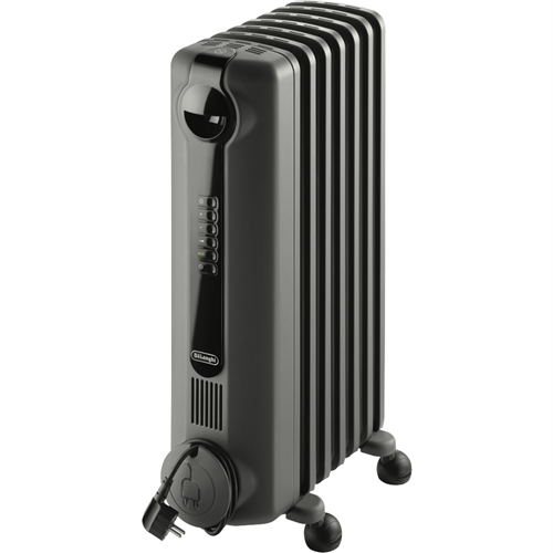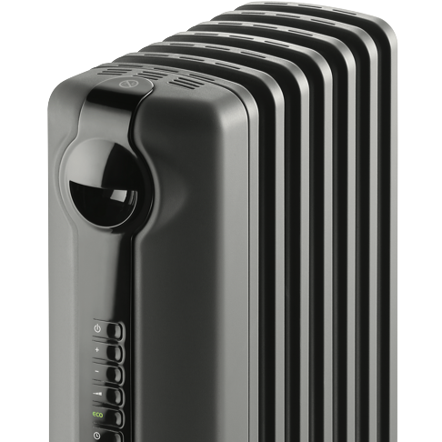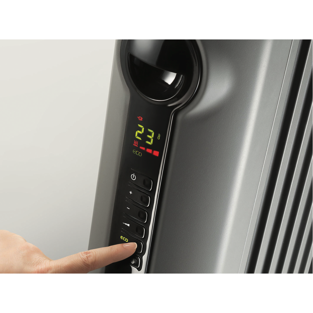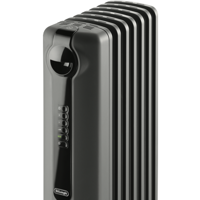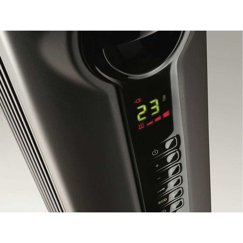 Quickly and noislessly generate rays of warmth with this DeLonghi 1500W Radia S Oil Column Heater with Timer TRRS0715E.G into a localised area using radiant heating. The electric powered 1500W heating element and portable design ensure warmth in any room. This column heater features a digital control panel that allows you to cycle through and select one out of the three power settings check the thermostat select a special function such as the Eco function set the timer and turn this heater on and off. The electronic thermostat can be set to the Eco function to automatically control the power setting according to a target temperature to optimise energy consumption. You can easily transport comfort from room to room with this DeLonghi column heater.