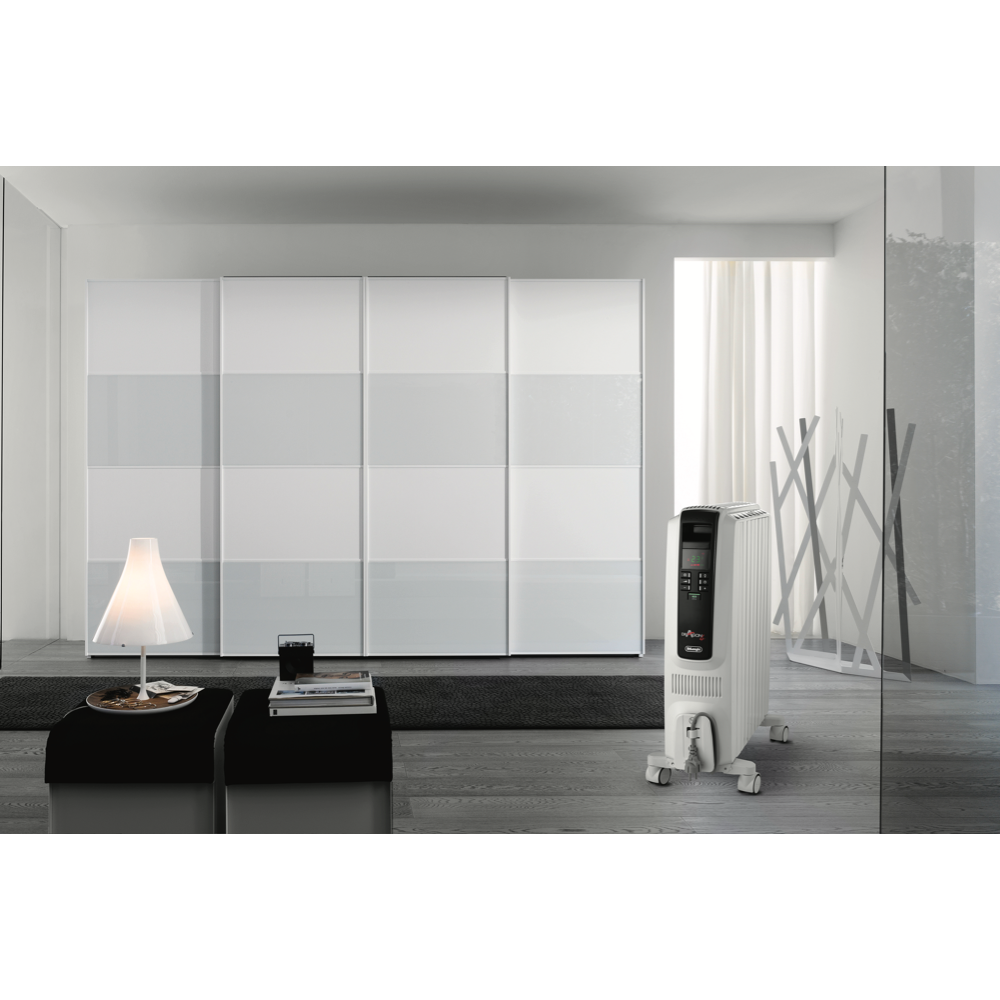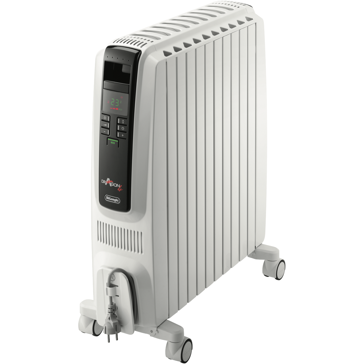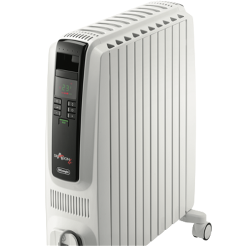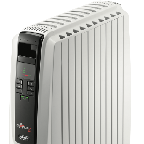 This DeLonghi 2400W Dragon 4 Oil Column Heater w/Timer (TRD42400ET) features radiant heating allowing you to produce waves of fast heat cost-effectively and noiselessly with no moving parts into a localised area. The powerful electric 2400W heating element and portable design ensure you can create warmth in any room. A digital control panel allows you to cycle through and select one out of the three power settings check the thermostat select a special function such as the Eco function set the timer and turn this heater on and off. The electronic thermostat can be set to the Eco function to automatically control the power setting according to a target temperature to optimise energy consumption. Plus prevent hazards due to overheating thanks to this DeLonghi column heater's thermal and tip-over cut-off. You can easily transport comfort from room to room with this DeLonghi column heater.