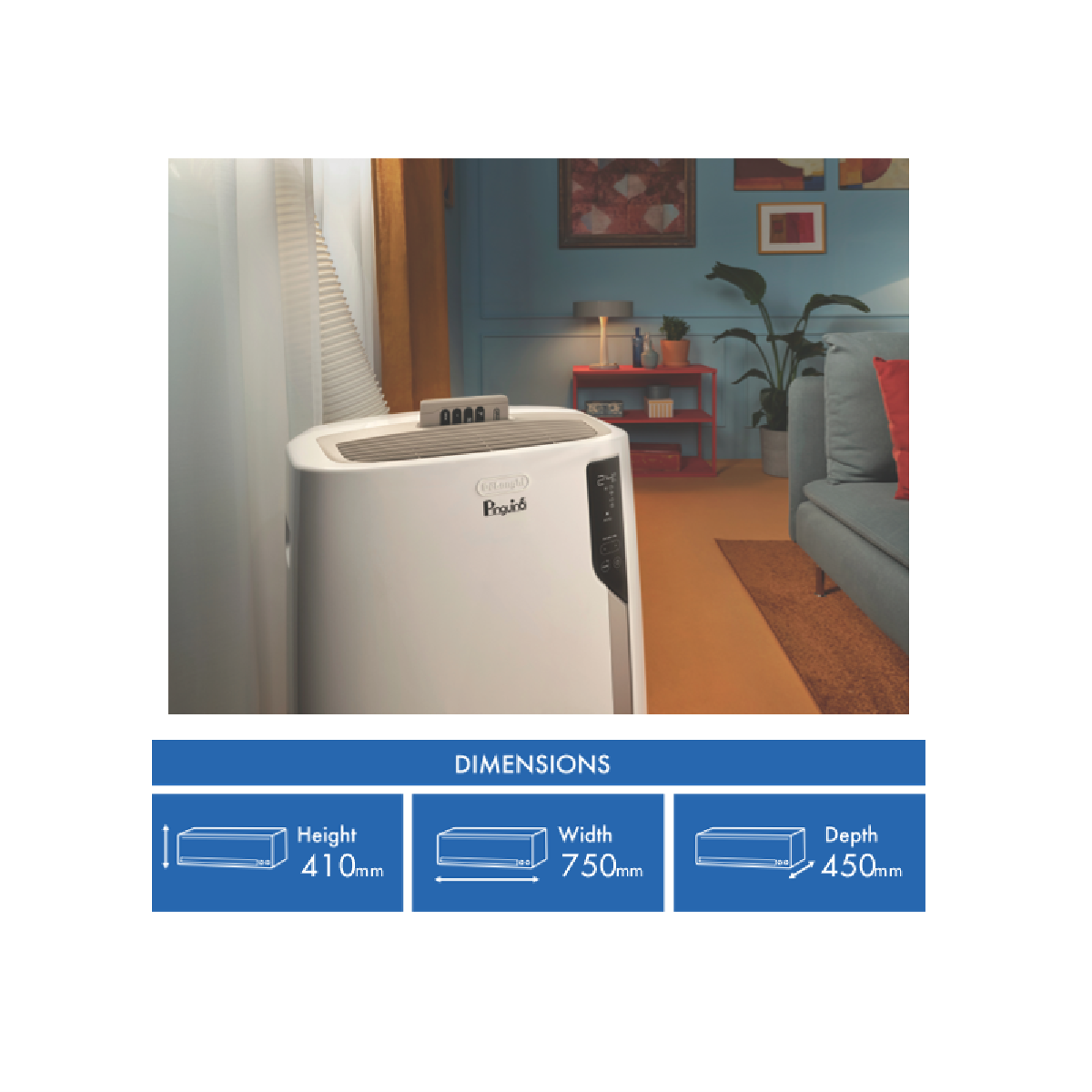 Escape the summer heat with the DeLonghi 2.9kW Portable Air Conditioner. This powerful and versatile 3-in-1 unit provides cooling fan and dehumidification modes to transform any room into an oasis. With its brilliant white finish and compact size measuring just 450mm wide by 750mm high and 410mm deep it blends into any decor. The 2.9-kilowatt cooling capacity covers spaces up to 80sqm to eliminate hotspots in bedrooms living rooms and offices. Program the 24-hour timer to match your schedule. Operate it anywhere with smooth castors extendable window bracket and easy-to-configure window kit. This portable AC unit includes an antibacterial filter and active carbon filter to purify incoming air. The user-friendly electronic control panel provides effortless operation. Experience the difference of DeLonghi a global leader in air conditioning renowned for quality and innovation. This model carries a 2-year manufacturer's warranty for peace of mind. The Manufacturer Part Number is PACEL110WIFI. Transform your space with the cooling power and versatility of the DeLonghi Portable Air Conditioner today.