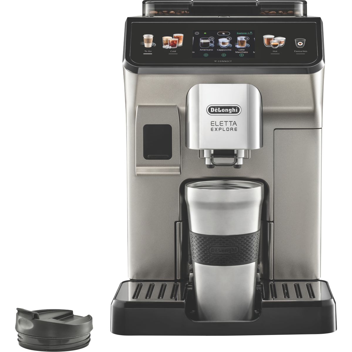 Brew barista-quality coffee from the comfort of your own home with the DeLonghi Eletta Explore Wifi Connect Titan automatic coffee machine. This sleek titanium automatic coffee machine allows you to easily craft delicious espresso long blacks and lattes at the touch of a button. With a powerful 19 bar pump and patented LatteCrema system the Eletta Explore delivers creamy milk froth and optimally extracted coffee every time. Connect via WiFi to access 5 customizable user profiles adjust grind size coffee strength and milk temperature and more through the intuitive 3.5 TFT display. The integrated conical burr grinder with 13 adjustable settings grinds beans fresh for each brew while the removable 1.8L water tank and dishwasher safe parts make cleaning and descaling easy. Brew coffee just the way you like it with the Eletta Explore's wide range of features. The manufacturer's part number for this product is ECAM45086T. Make your choice today with this user-friendly bean-to-cup automatic coffee machine from DeLonghi.