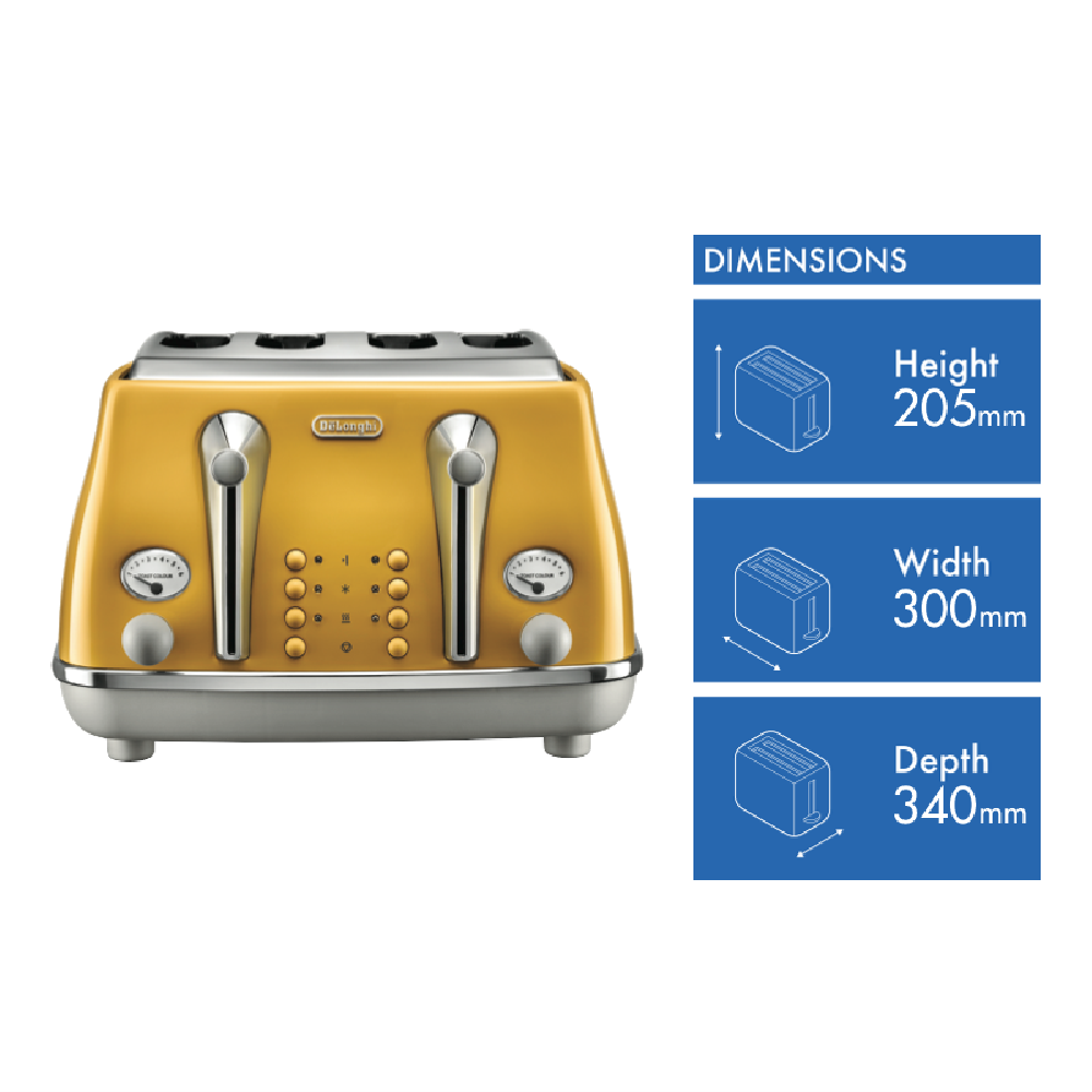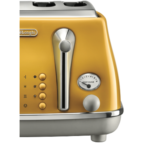 Add a splash of colour to your kitchen with the iconic DeLonghi Icona Capitals Yellow 4 Slice Toaster. Crafted in stainless steel with a unique glossy finish and chromed details this stylish toaster will look stunning on your countertop. With 1800 watts of power it can toast up to 4 slices of bread at a time. The variable browning control and defrost function ensure perfect results every time while the high lift lever makes removing smaller slices safe and easy. This toaster features a removable crumb tray for quick cleanups and neon indicator lights so you can monitor each function. Backed by a 2 year manufacturer's warranty the Icona Capitals toaster combines classic style with modern convenience. With its sleek retro-inspired design in a vibrant yellow this DeLonghi toaster will give your kitchen a fun contemporary edge. The manufacturer's part number for this product is CTOC4003Y. Add this eye-catching toaster to your cart today for delicious golden brown toast every morning.