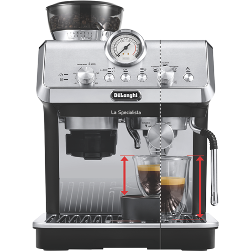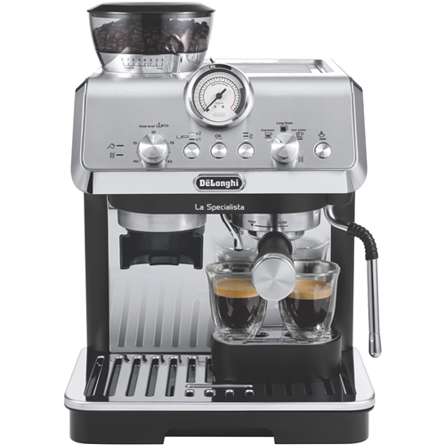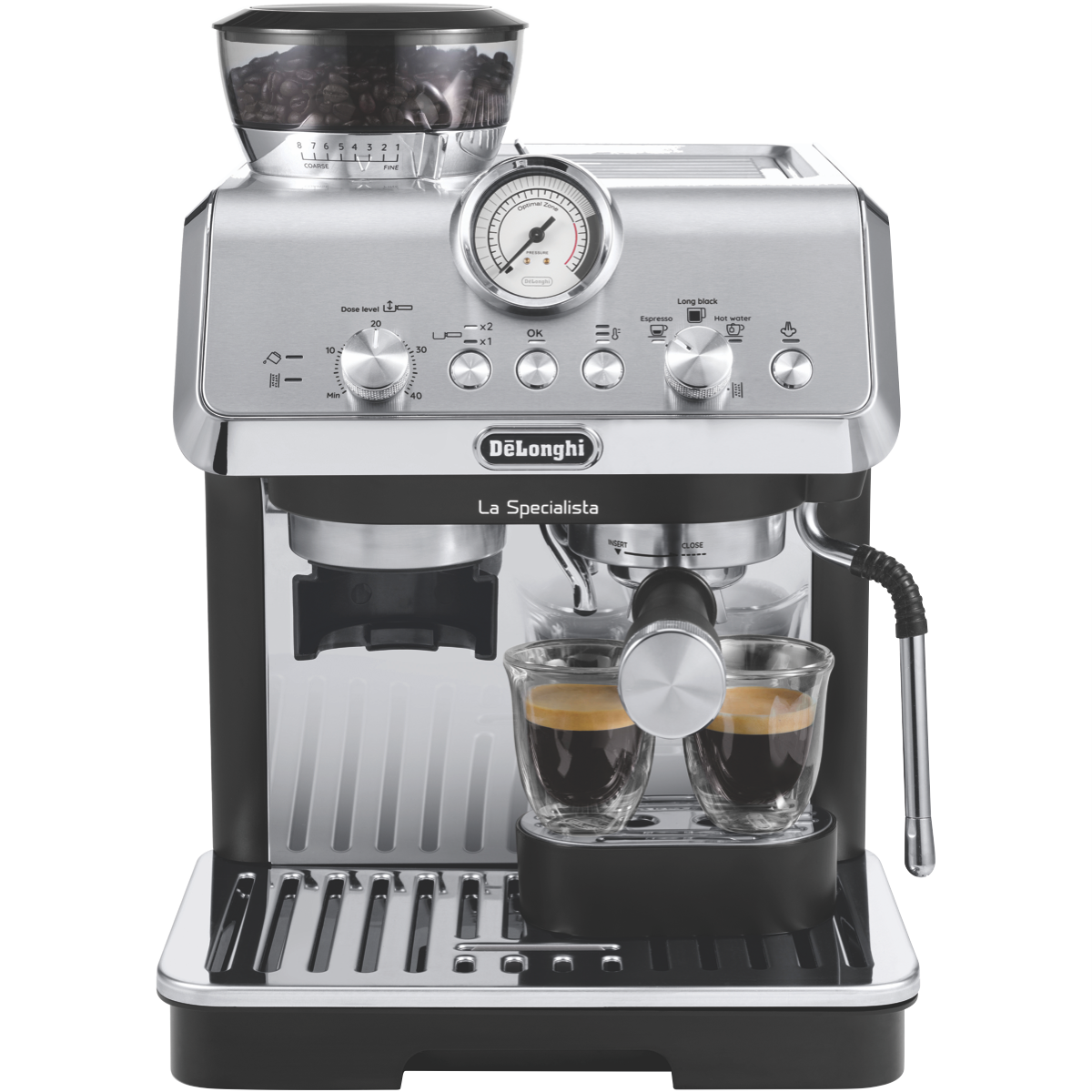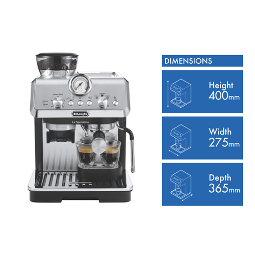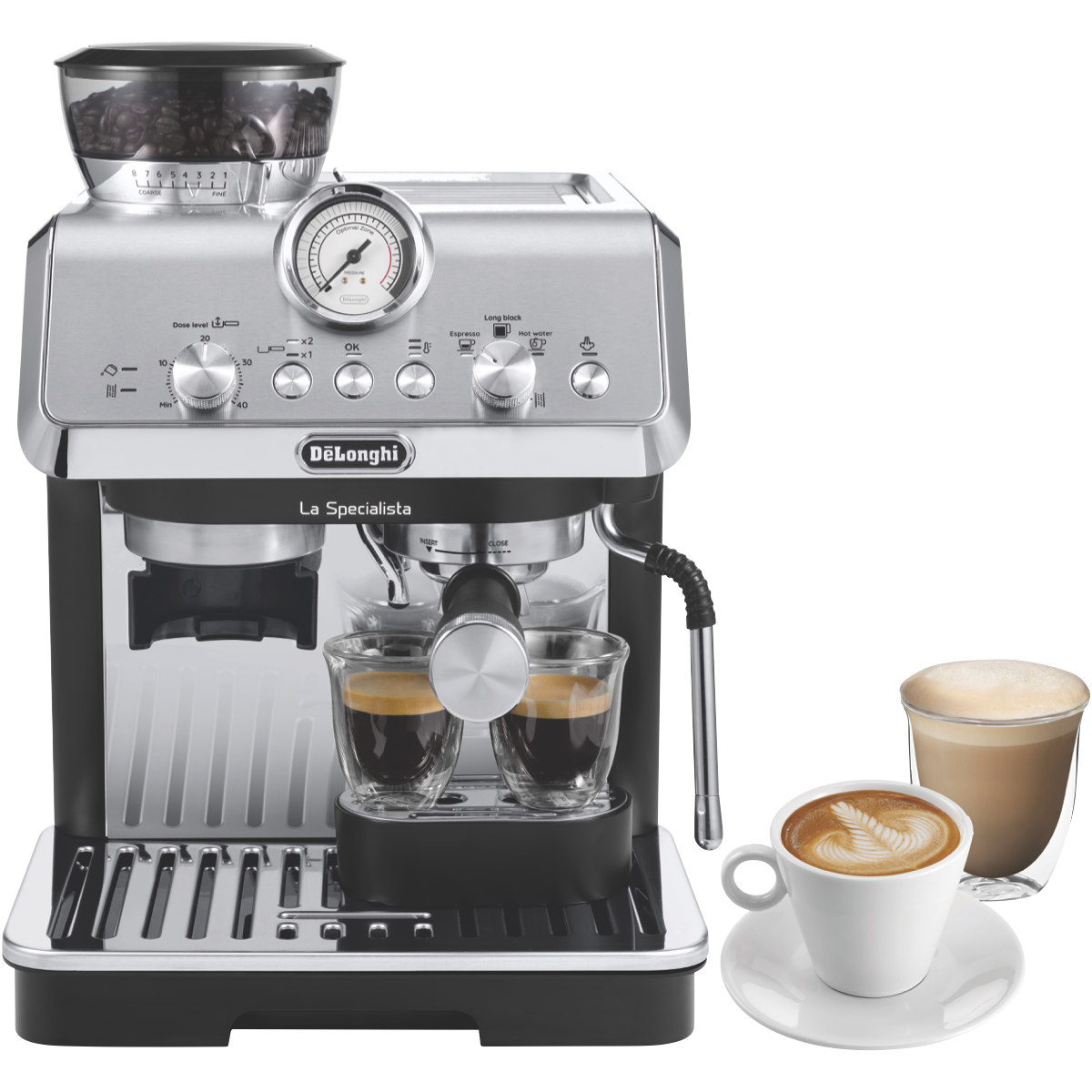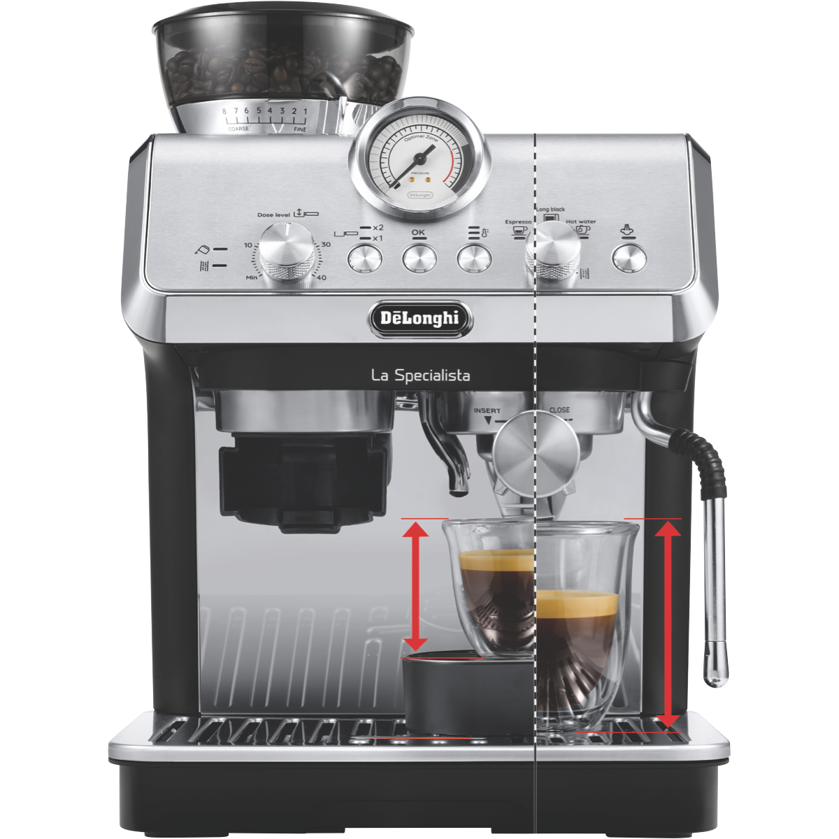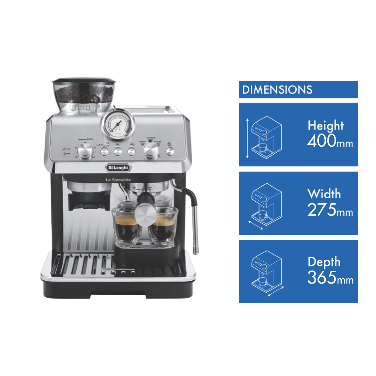 Making great coffee is both a science and an art form so leave it to the DeLonghi La Specialista Arte Manual Coffee Machine EC9155MB to guide you through a simple coffee preparation process with included premium barista accessories and exclusive technologies for perfecting your favourite brew just like at the local café. Unlock the aroma and flavours from coffee beans with full control and personalisation every step of the way from grinding dosing tamping and texturing. For ultimate extraction and to ensure no freshly grounded coffee is wasted La Specialista Arte comes with a uniquely designed Dosing & Tamping guide so you can tamp like a barista and apply the right pressure for a precise coffee dose with no spillage outside the portafilter. A high-performing Thermoblock with excellent temperature control guarantees precise thermal stability for optimal coffee extraction. Select from three infusion temperatures to extract the best flavours according to the type of coffee beans used and choose from either a full-bodied single or double espresso or an aromatic and light long black. Plus handcraft velvety silky textured microfoam with little to no air for deliciously creamy cappuccinos or latte art creations with this DeLonghi coffee machine's My LatteArt powerful steam wand. Be the barista in your own home and enjoy the art of making coffee with the DeLonghi La Specialista Arte coffee machine.