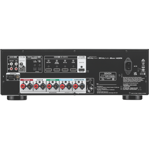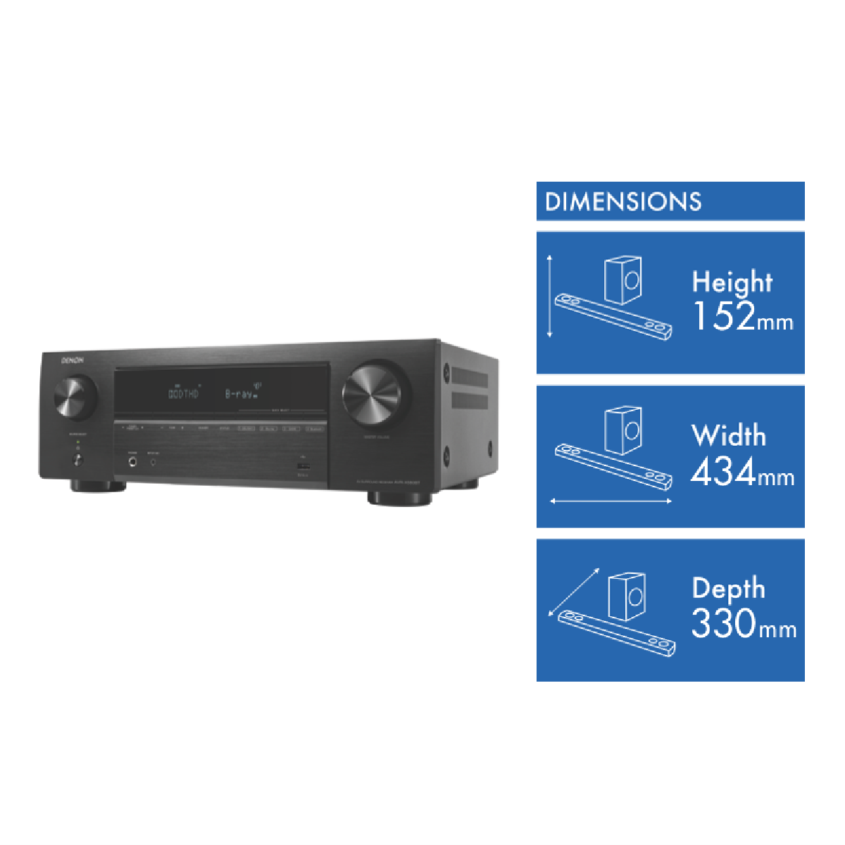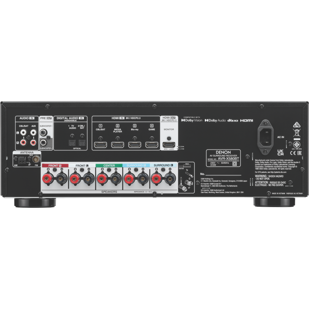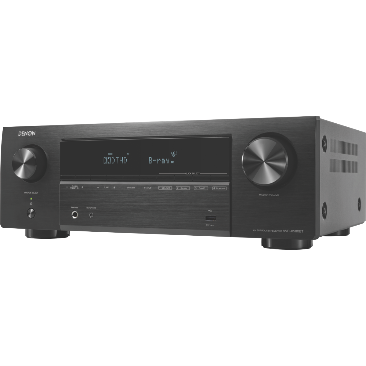 Bring the cinema experience home with the Denon 5.2Ch Home Theatre Amplifier. This powerful home theatre system delivers immersive 130W per channel sound filling your living room with crisp clear audio. The 5.2 channel configuration and Dolby Atmos decoding produce a surround sound experience that transports you right into the movie. Connect up to 4 HDMI devices like your Blu-ray player or gaming console and experience your entertainment in vivid detail. With DTS HD Master Audio support the Denon faithfully reproduces every note and nuance encoded in your movies and music. The amplifier makes it easy to set up your home theatre too with an on-screen display and remote control. Enjoy wireless music streaming over Bluetooth for a clutter-free entertainment system. Designed and engineered for performance and longevity the Denon Home Theatre Amplifier brings an unforgettable cinematic experience into your home. The manufacturer's part number for this product is AVRX580BTBKEA. Bring the magic of the movies home with the Denon Home Theatre Amplifier today.