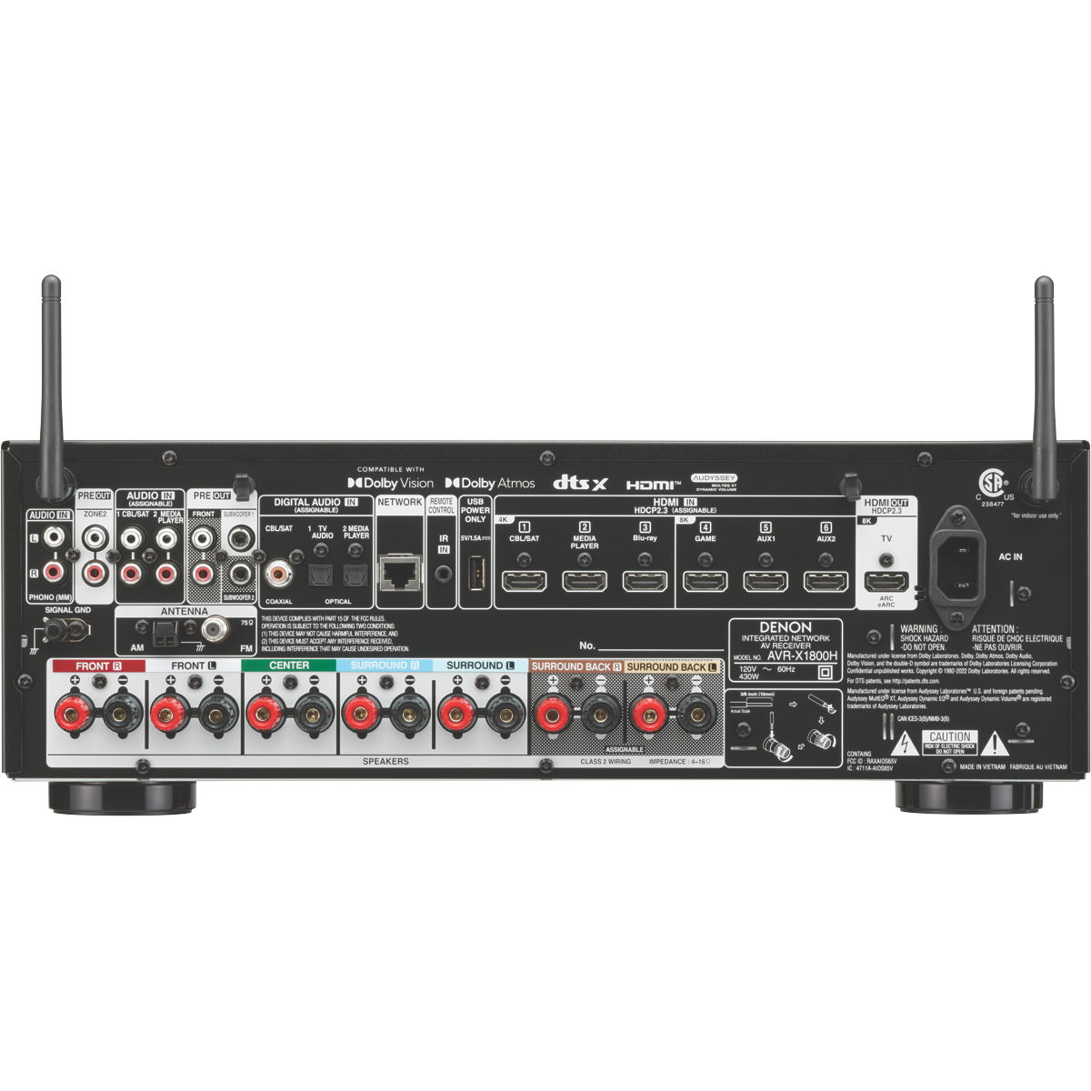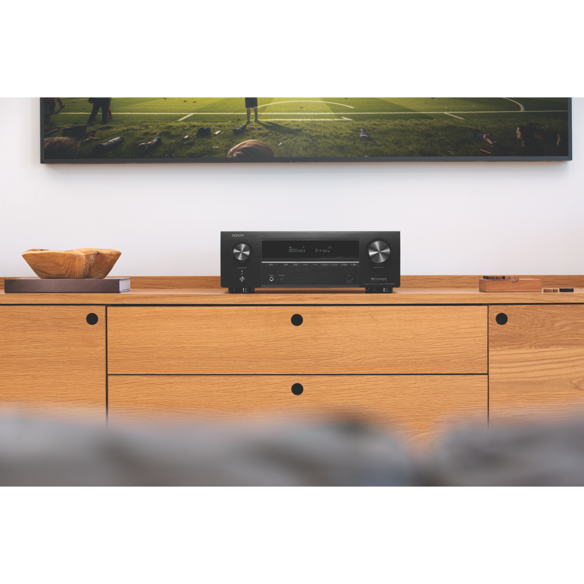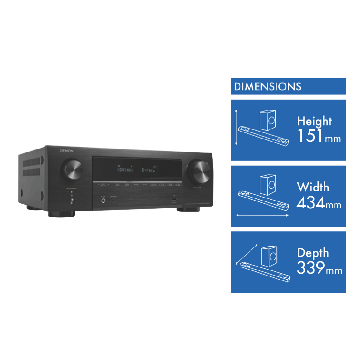 Step into an immersive home theatre experience with the Denon 7.2 Ch 8K AV Receiver. This sleek black receiver delivers powerful room-filling 80W per channel sound and supports up to 7.2 channels for multi-dimensional audio. Connect up to 6 devices via HDMI and control it all through the handy remote app on your smartphone. With 6 HDMI inputs and 1 output you can easily connect your Blu-ray player gaming console streaming stick and more. The intuitive on-screen display makes adjustments a breeze. Measuring 151mm H x 434mm W x 339mm D the compact receiver fits into your home entertainment setup with ease. Enjoy up to 8K video passthrough and your favourite audio formats like Dolby Atmos for truly cinematic sound. The included RC-1257 remote puts command at your fingertips. Bring the excitement of the movies into your living room with the Denon receiver. Backed by a 2 year manufacturer's warranty for peace of mind. The manufacturer's part number for this product is AVRX1800BKEA. Experience immersive home entertainment with Denon.