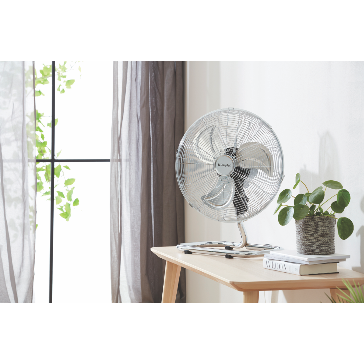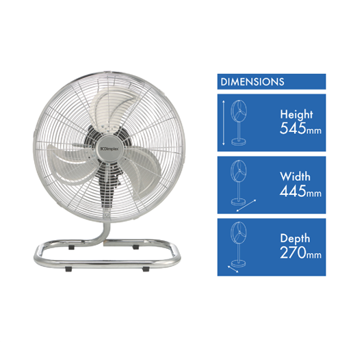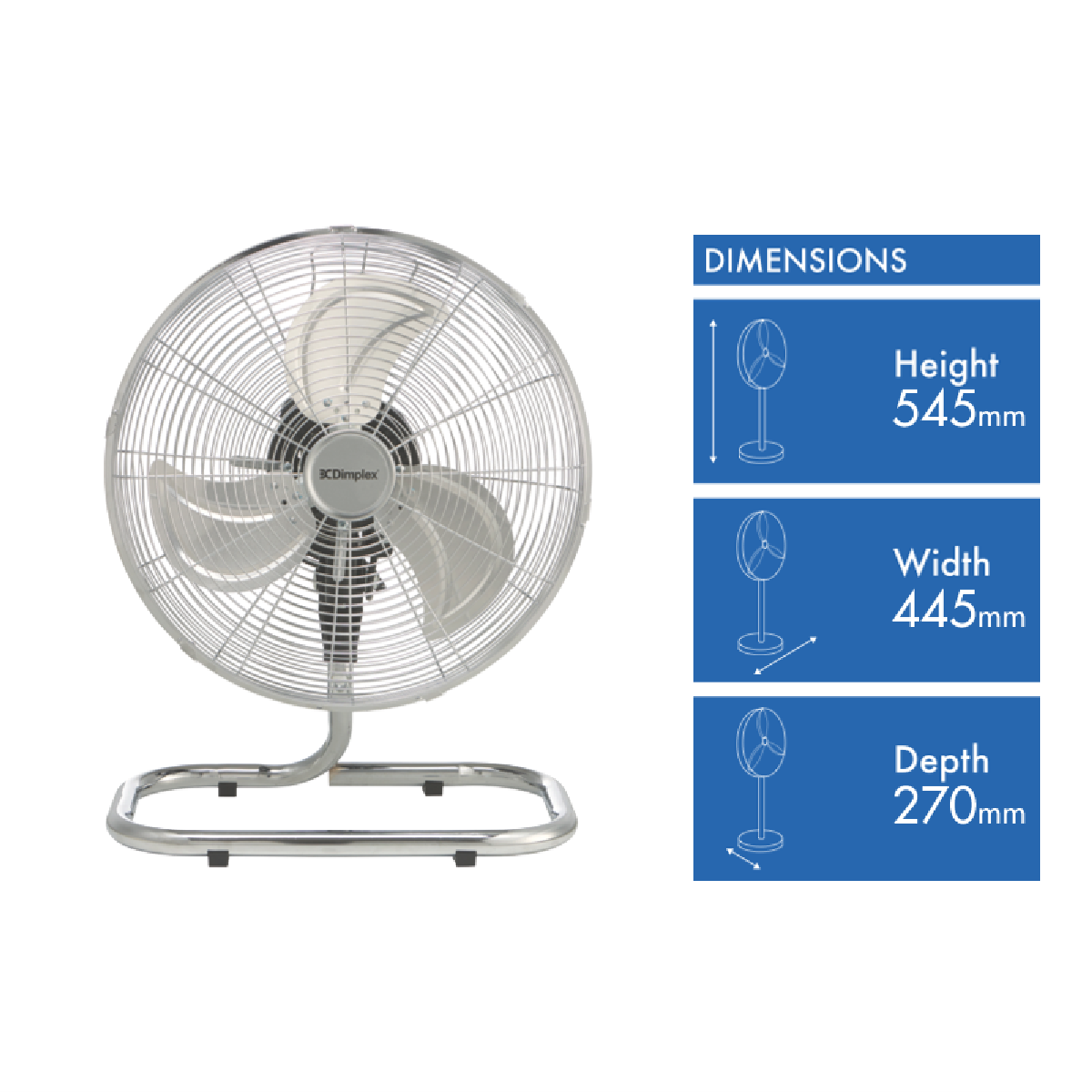 This Dimplex portable fan is a floor fan. You can cool a room fast with its 3 speed settings. Plus the Dimplex DCFF40CH has a 575mm height a 245mm depth and a 445mm width. It has a chrome finish. Conserve energy by only cooling the space you are using thanks to this Dimplex portable fan.