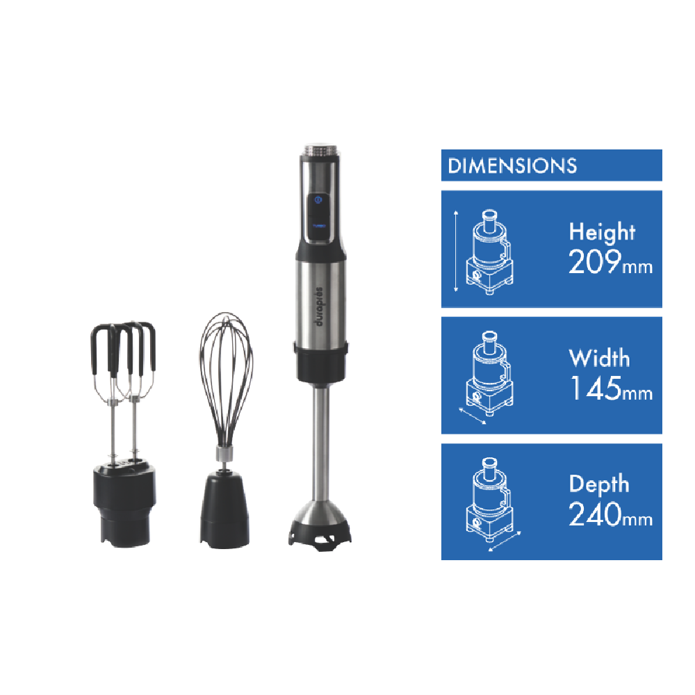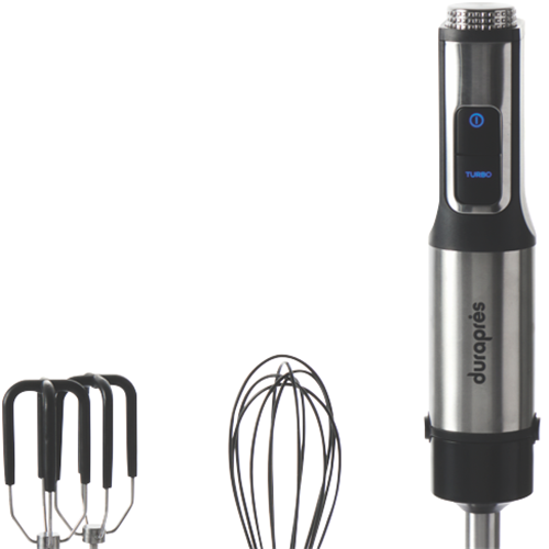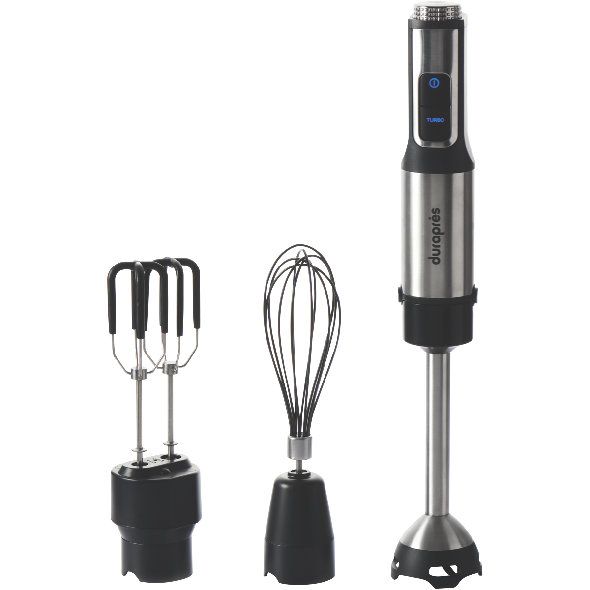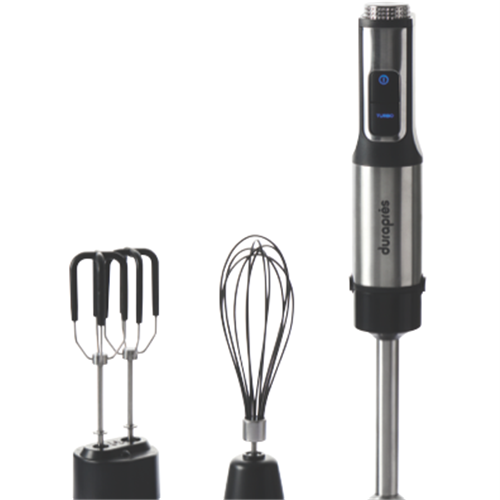 Need a hand in the kitchen? This Durapres Beat Blitz Hand Mixer Set is ready to help. With 600 watts of power it can tackle tough mixing jobs with ease. The titanium-coated blades and stainless steel rod make quick work of ingredients while the anti-scratch coating keeps your bowls looking good as new. You get four attachments to handle different tasks - an immersion blender double beaters and a whisk. At just 1.12 kg it's light enough to use comfortably. The 1-meter cord gives you room to move around the kitchen. Plus it comes with a 2-year warranty for peace of mind. Whether you're whipping up a cake or blending a soup this mixer set has you covered. The model number is DSM550.