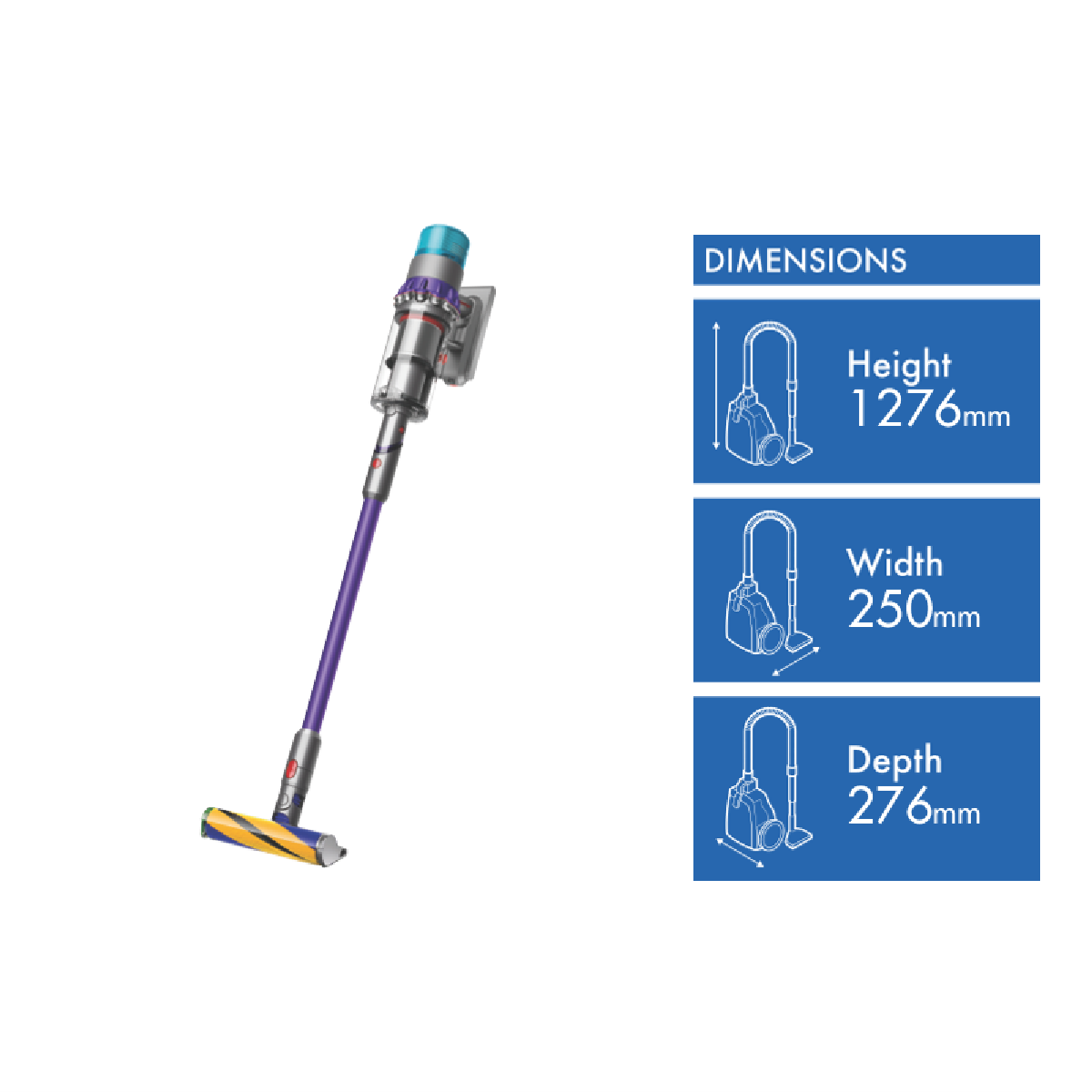The Dyson Gen5detect Absolute Cordless Vacuum is Dyson's most powerful HEPA cordless vacuum(1). Sucks up with Dyson's most power-dense motor yet(8) spins at 135000rpm generating Dyson's most powerful suction(1). With Radial Root Cyclone technology 14 scrolled cyclones generate up to 100000g of force to capture dust and debris from the airflow. Maintaining maximum suction power. Dyson's Gen5's Fluffy Optic cleaner head reveals 2 times more dust so you don't miss anything(3). Whole machine filtration captures 99.99% of particles as small as 0.1 microns(2). Helping to keep your home cleaner and more hygienic. A piezo sensor counts and sizes particles 15000 time a second automatically increasing power where needed(6). An LCD screen displays the data to show when your floor is clean(4). Get up to 70 minutes runtime(5) with it's advanced 10-cell battery it delivers Dyson's longest runtime in a cordless vacuum(5). While standby mode and advanced battery chemistry maximise it's lifespan. Versatile Dyson Gen5 cordless technology - for cleaning all floor types hard to reach places mattresses sofas and stairs. New single button power control you have power at the touch of a button with no trigger to hold. Transforms into a handheld in a click. The built-in crevice tool is always at your fingertips. Switch easily between three power modes auto mode automatically adjusts suction power across different floor types to maximise battery life. Boost mode is for intensive spot cleaning and Eco mode for longer cleans on all floor types. Hygienic ejection mechanism drives dust and debris deep into your bin in one action. Digital Motorbar with de-tangling vanes - Intelligently adapts suction power to different floors(7). Hair removal vanes automatically de-tangle hair from the brush bar as you clean. The Dyson Gen5detect vacuum drops into the charging dock ready for your next clean. The washable lifetime HEPA filter and Fluffy Optic roller reduces waste engineered to reused not replaced. Disclaimers: (1) Suction tested to IEC62885-4 CL5.8 and CL5.9 tested at the flexible inlet loaded to bin full in Boost mode by independent third-party SGS-IBR Laboratories US in 2022. (2) Filtration tested against ASTM F3150 tested in Boost mode by independent third-party SGS-IBR Laboratories US in 2022. Filtration efficiency is calculated by comparing the number of standardised dust particles entering the vacuum cleaner against those released. The capture rate may differ depending on actual environment and the mode. (3) Compared to the original Dyson Laser Slim Fluffy cleaner head. Effectiveness influenced by ambient light conditions debris type and surface (4) Best accuracy achieved in Auto mode. Auto ramp feature in Auto mode only. Testing based on average in home usage according to Dyson internal test data (5) Applies in Eco mode on hard floor. Actual run time will vary based on power mode floor type and/or attachments used (6) Quantity and size of dust displayed on screen varies depending on usage. Examples shown may occur within one or more displayed size range. Automatic suction adaptation only occurs in auto mode. (7) Dynamic Load Sensing technology only applies in Auto mode with the Digital Motorbar cleaner head attached. (8) Compared to the Dyson V15 Detect(TM) vacuum.