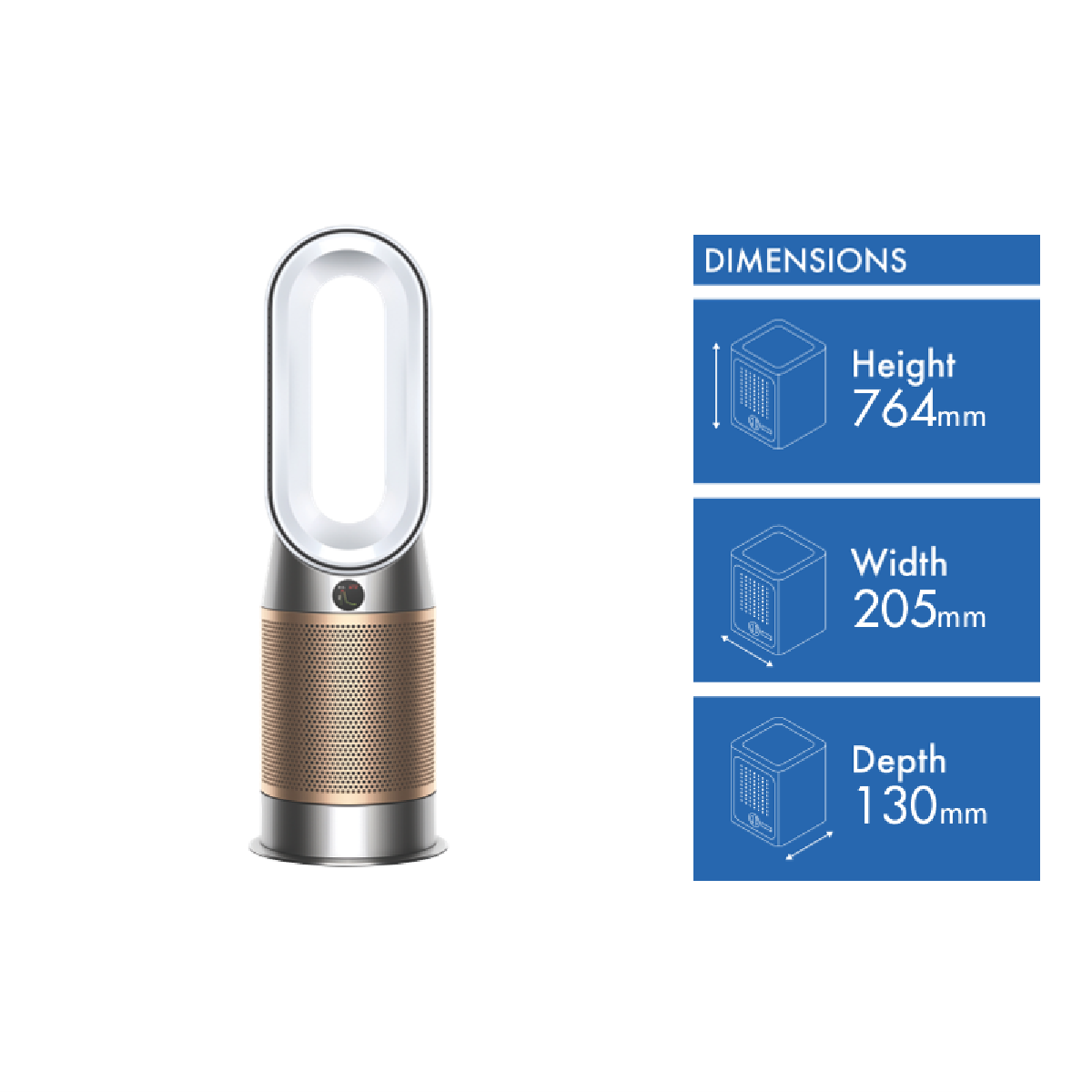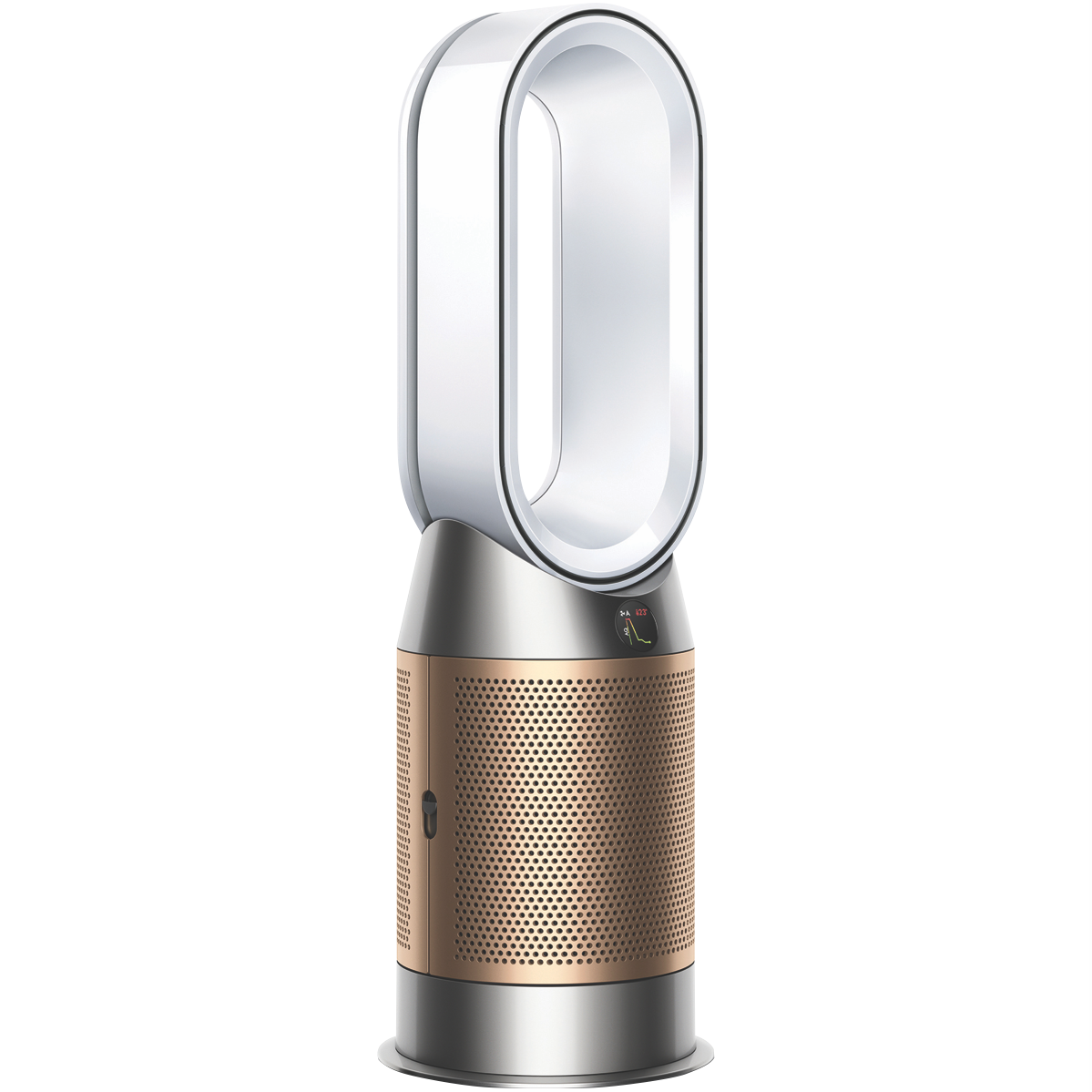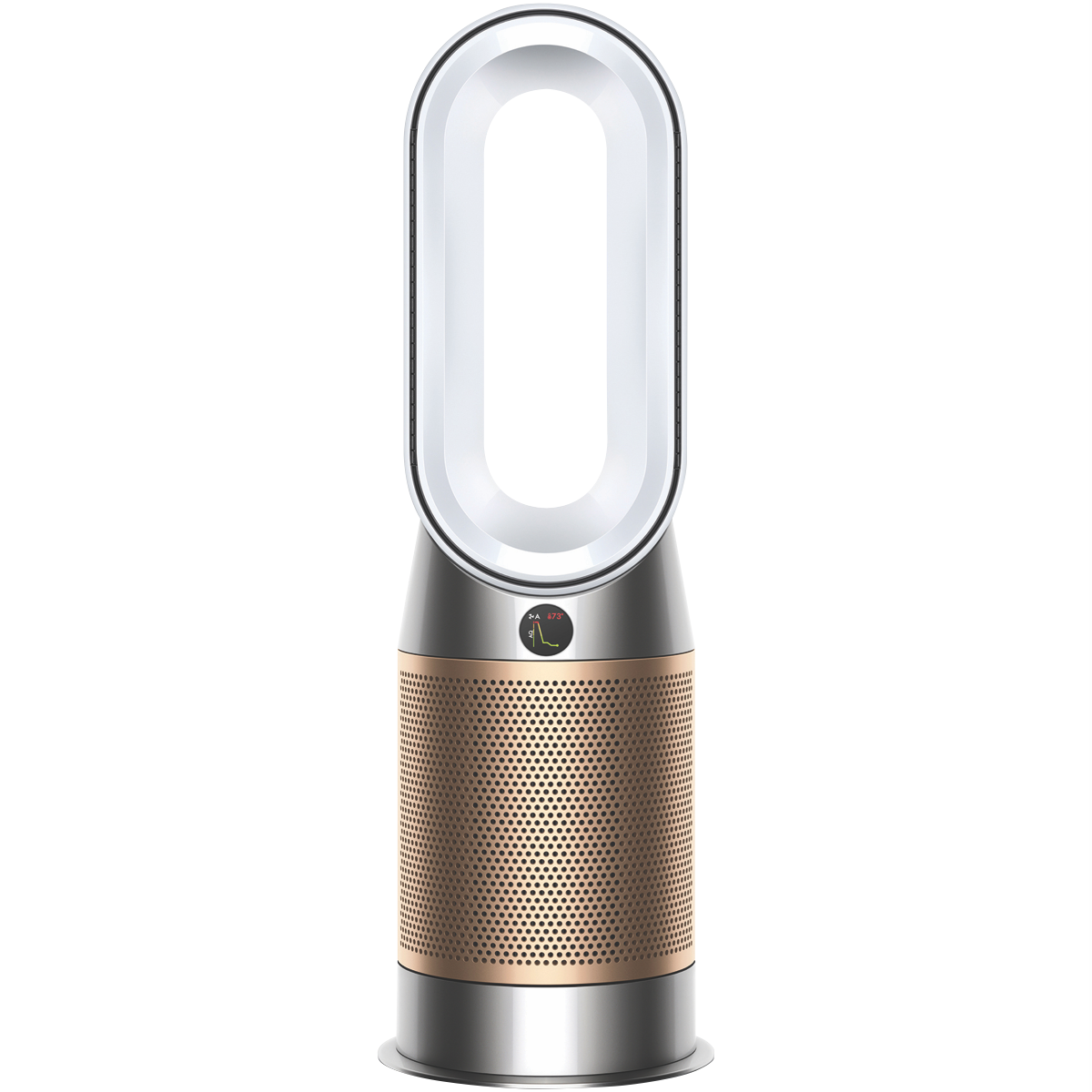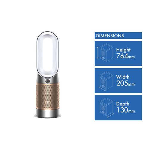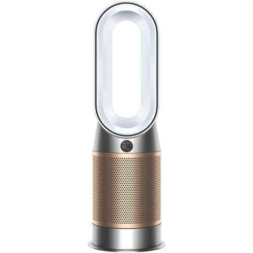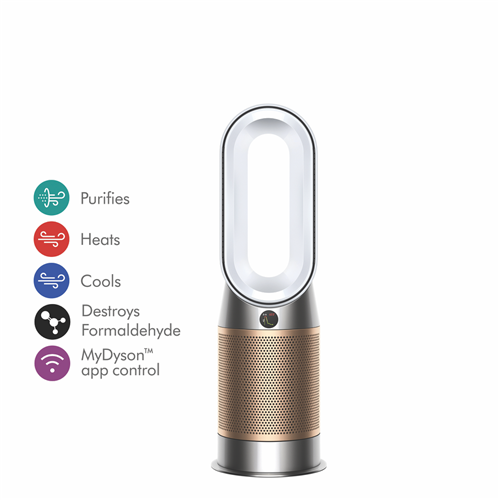 The Dyson HP09 Hot+Cool Formaldehyde Fan Heater 379629-01 in White/Gold captures dust and allergens. Even destroys formaldehyde(1) and removes up to 99.95% of particles as small as 0.1 microns(2). Automatically detecting formaldehyde airborne particles and gases the Dyson HP09 then diagnoses and reports them in real time. The sealed airflow and filtration system ensures the whole machine not just the filter meets HEPA H13 (3) standard. What goes inside stays inside thanks to the catalytic filter continuously destroys formaldehyde and doesn't need replacing(1). Air Multiplier technology generates the circulation power to purify the whole room(4). Control and monitor air your quality from anywhere using the Dyson Link app(5). Control it hands-free with compatible voice services(6). With long-range projection it's quick to heat the whole room evenly(7). In warmer weather a powerful stream of purified airflow can cool you down. Disclaimers: (1) Third party full machine testing based on GB/T 18801-2018 formaldehyde cumulative clean mass testing with continuous injection until plateau of formaldehyde CADR is achieved. Results may vary in practice. (2) Tested for filtration efficiency at 0.1 microns (EN1822). (3) Particle challenge by DEHS oil specified in EN1822 within a chamber specified in ASTM F3150. Tested in Max Mode at IBR US for whole machine efficiency above 99.95%. (4) In maximum setting. Tested for air projection purification coverage in a 81m3 room. (5) Requires device to run app Wi-Fi or mobile data Bluetooth 4.0 support and iOS version 10 or Android version 5 (or above). Standard data and messaging rates may apply. (6) Refer to the Dyson Link app for compatible voice services. (7) In maximum setting. Tested for air projection purification coverage in a 81m3 room and heating performance in a 35m3 room.