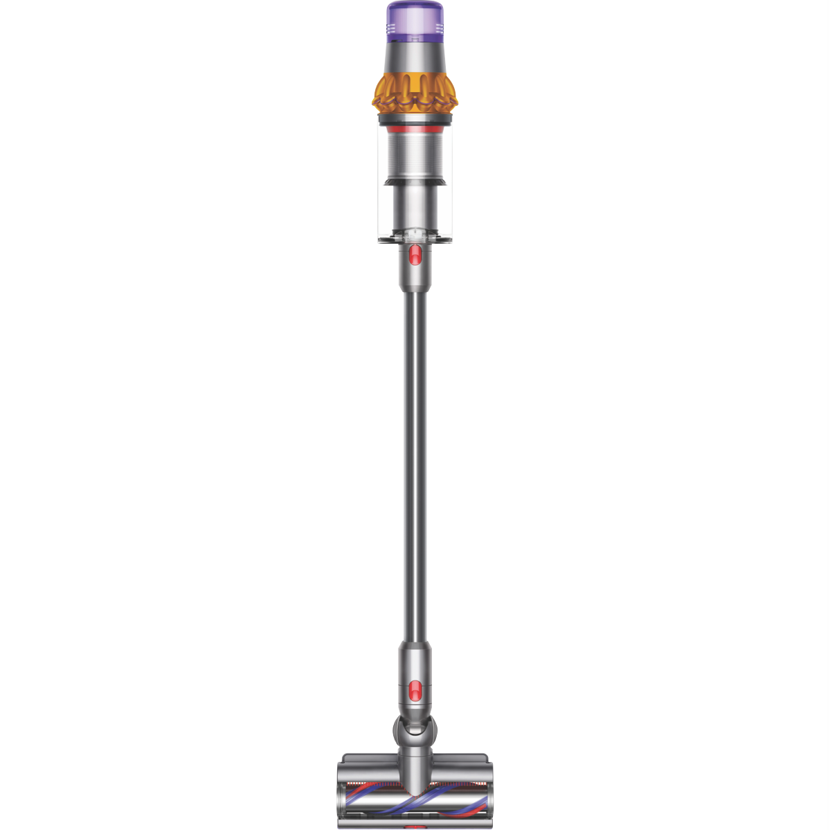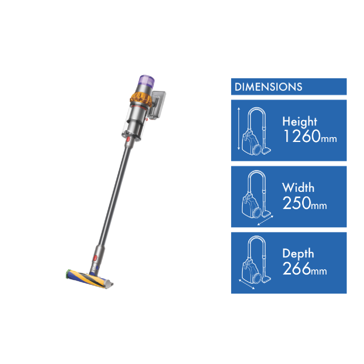The Dyson V15 Detect Absolute Cordless Vacuum (447955-01) has a Fluffy Optic(TM) cleaner head that reveals 2 times more microscopic particles(1) a piezo sensor continuously sizes and counts dust particles automatically increasing suction power when needed(3). LCD screen shows scientific proof of a deep clean the LCD screen shows what's been sucked up displaying in real time(4). Powered by a Dyson Hyerdymium(TM) motor spinning at up to 125000rpm generating powerful Dyson suction(2). With up to 60 minutes of fade-free power(6) it provides powerful suction to clean your home and car. Dyson DLS(TM) technology inside the Digital Motorbar(TM) cleaner head monitors brush bar resistance 360 times a second intelligently adapting power across different floor tyoes automatically with no need to change cleaner heads(5) Quickly transforms to a handheld and back again in just one click. Three cleaning modes optimised for a variety of tasks The right balance of power and run time where you need it. The fully sealed filtration system traps 99.99% if particles as small as 0.3 microns(7). The 'point and shoot' mechanism hygienically ejects dust and debris into your bin in one action so there's no need to touch the dirt. Dyson's power-optimising technology and battery-saving trigger help maximise run-time only using power when you need it. 14 cyclones generate forces of 100000g to fling dust into the bin without clogging the filter so there's no loss of suction. Designed to absorb vibrations and dampen sound to keep sound levels down Disclaimers: (1) Compared to the original Dyson Laser Slim Fluffy(TM) cleaner head. Effectiveness influenced by ambient light conditions debris type and surface.(2)Suction tested to IEC 62885-4 CL5.8 and CL5.9 loaded to bin full in Boost mode(3)Quantity and size of dust displayed on screen varies depending on usage. Automatic suction adaptation only occurs in auto mode. (4)Quantity and size of dust displayed on screen varies depending on usage. Examples shown may occur within one or more displayed size range(5)In Auto mode. (6)In Eco mode on hard floors. (7)Tested against ASTM F1977-04 (particles sized 0.3-0.5 microns) tested in Boost mode. (8)Pick up tested to IEC 62885-4 Ed1.0 2020 Cl5.5 in boost mode. De-tangling capability based on internal Dyson test method.(9)Additional battery available to buy separately.