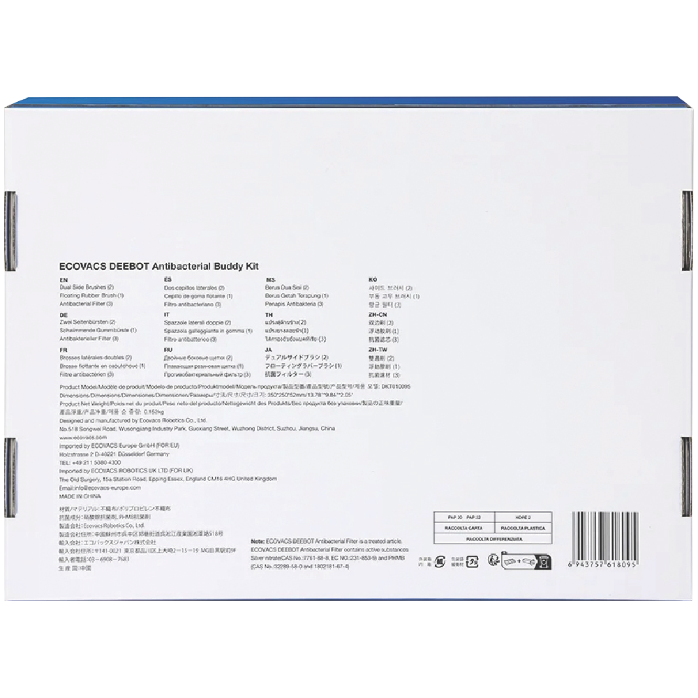 Keep your DEEBOT T20 OMNI robot vacuum in top condition with this Antibacterial Buddy Kit. Designed specifically as an attachment for your robot vacuum this kit comes packaged in a box measuring 380mm high 340mm wide and 290mm deep. At just 3kg it's easy to store until needed for maintenance. The DEEBOT-T20 ANTIBAC-BUDDY KIT ensures your cleaning companion stays in perfect working order.