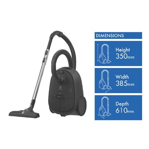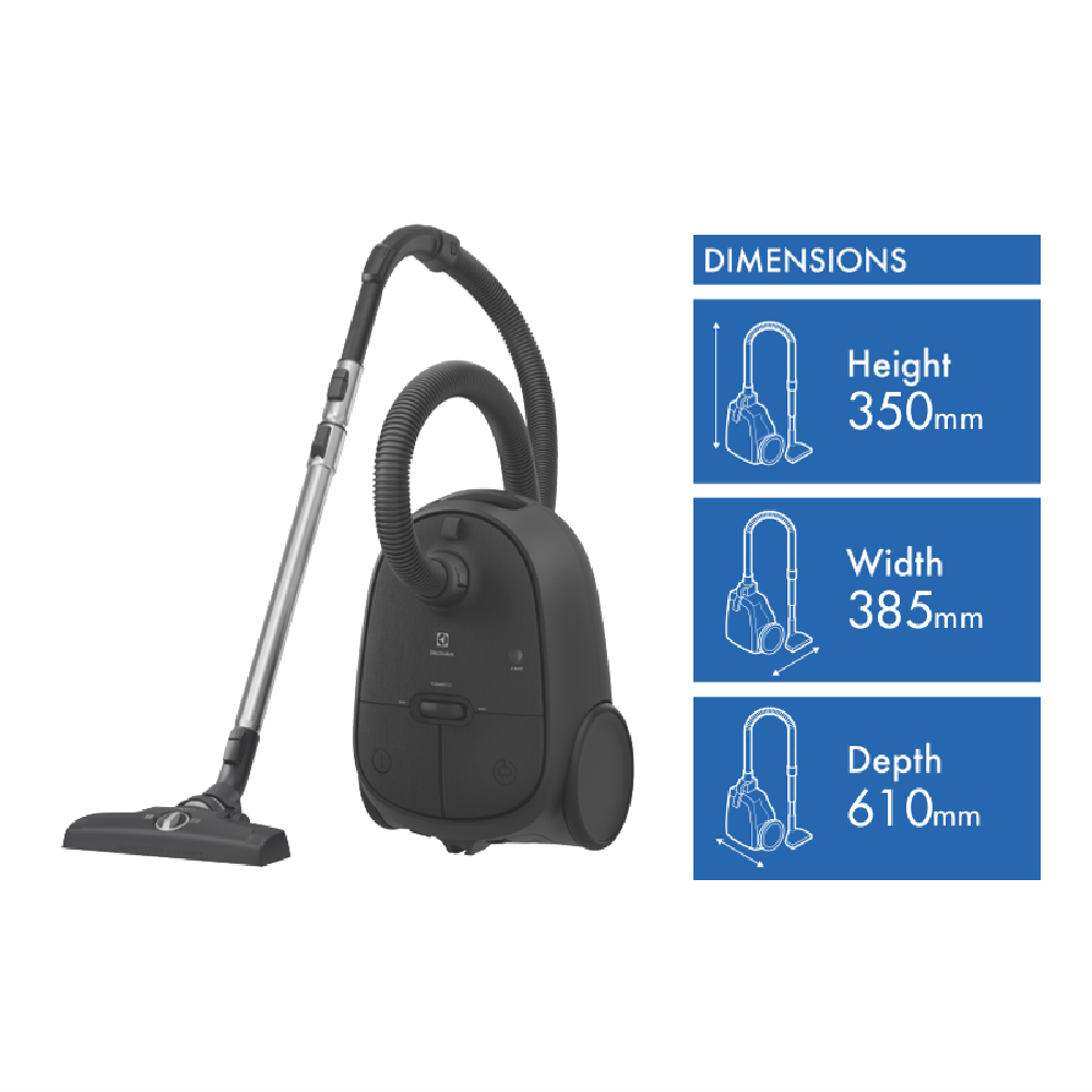 Clean 600 Bagged cleaner combines auto floor mode on the nozzle with intuitive accessibility for uncompromised performance and fewer interruptions. Now you can clean easily with the full foot control feature. Adjust cord rewinder on/off button and power setting without using your hands. HEPA filtration system is capable of filtering up to 99.98%(1) of particles as small as 0.3 microns. *Based on internal tests on filtration of particle sizes 0.3-10 microns according to standard EN 60312-1 using standard sand/dust particles. Easy roll wheels make maneuvering on different floor surfaces effortless. The 12-metre radius of action means movement between rooms is fluid.