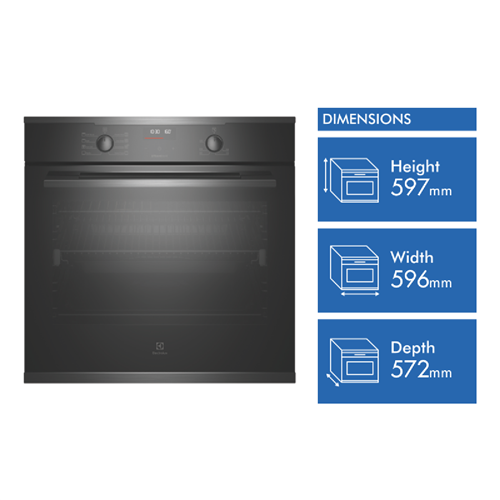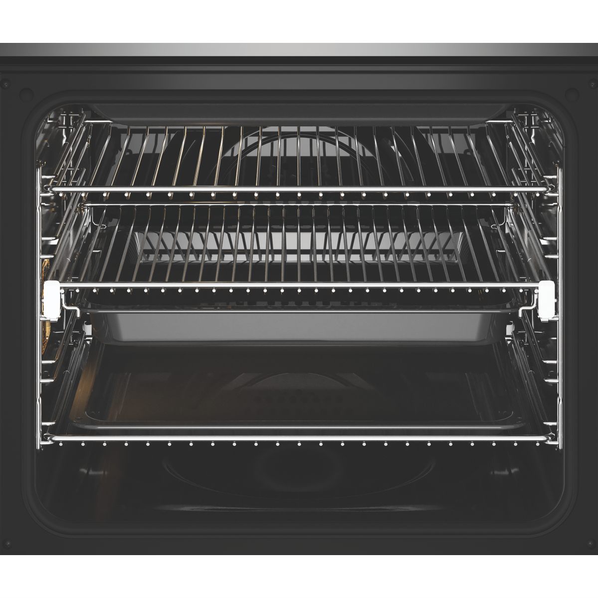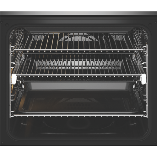 Create tasty dishes using one of eight cooking functions with the stunning Electrolux 60cm Multifunction Oven EVE614DSE in dark stainless. For crispy breads with a moist centre allow the combination of hot air and steam in the SteamBake setting to perfect bakery-style breads from home or bring frozen pre-cooked foods to the right temperature fast with the Rapid Heat function for enjoying a homemade meal or frozen packaged favourites straight out of the freezer. It has a 72-litre usable oven capacity. This Electrolux oven comes with a set of easy-glide fully extendable telescopic runners to easily and safely check up on your dinner creations while a triple-glazed oven door ensures the outside remains cool to touch. Plus the oven door frame can be easily removed and the glass panels detached from the frame to achieve a through clean. With a dark stainless-steel finish and premium-look aesthetics this electric oven integrates effortlessly into any modern kitchen.