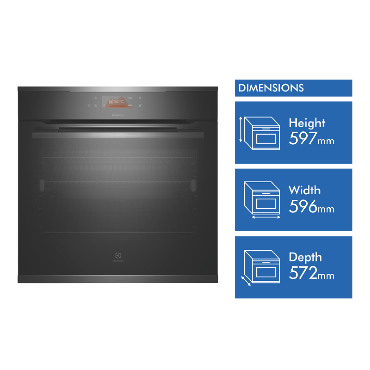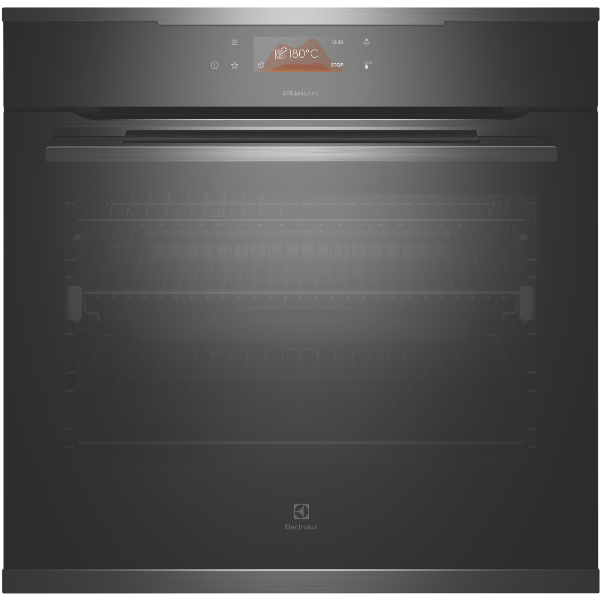 Take the guesswork out of cooking and the elbow grease out of cleaning with the stunning Electrolux 60cm Pyrolytic Oven EVEP615DSE in dark stainless steel. For tasty and succulent results the included smart food probe with sensor not only monitors the core temperature of roasts it'll even let you know when the desired temperature has been reached and will automatically stop cooking to prevent foods from drying out. Use the smart sensor food probe in conjunction with one of the cooking functions like Fan Cooking Traditional Bake Fan Assist Bake or Roast. Some functions are auto programs where the cooking function time and temperature are auto adjusted to deliver the best results when you either input the food weight or insert the food probe. To perfect bakery-style breads from home allow the combination of hot air and steam in the SteamBake setting to create crispy breads with a moist centre. This Electrolux oven comes with a set of easy-glide fully extendable telescopic runners to easily and safely check up on your dinner creations and a SoftMove door which can maintain an angled open position if needed and will close softly with a gentle push. For an easy clean select the Steam Assisted Cleaning function to loosen up food residue. With a dark stainless-steel finish and premium-look aesthetics this electric oven integrates effortlessly into any modern kitchen.