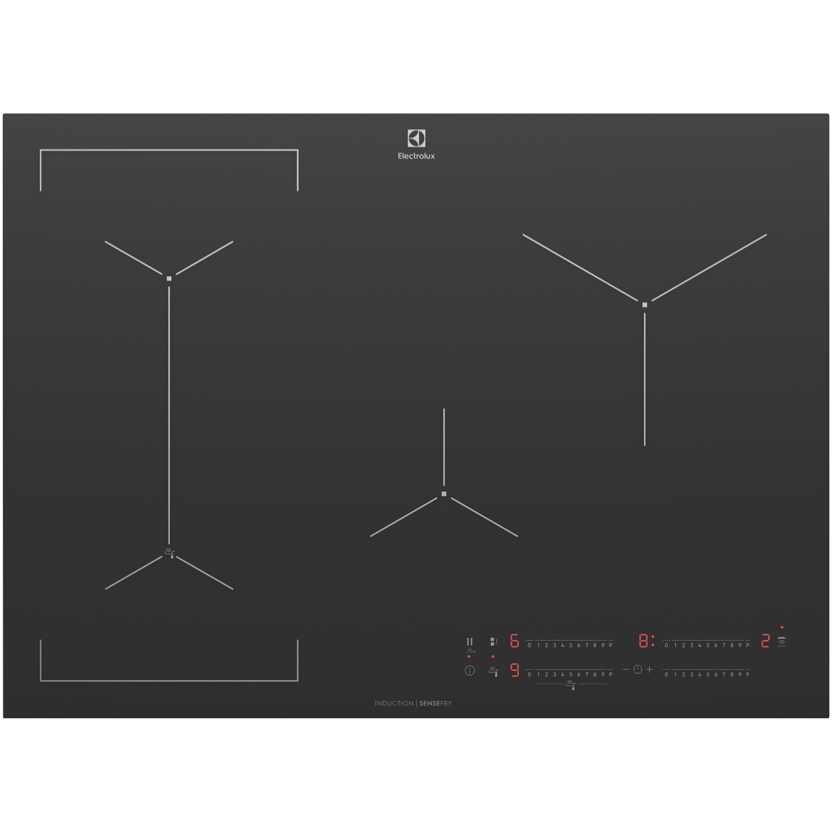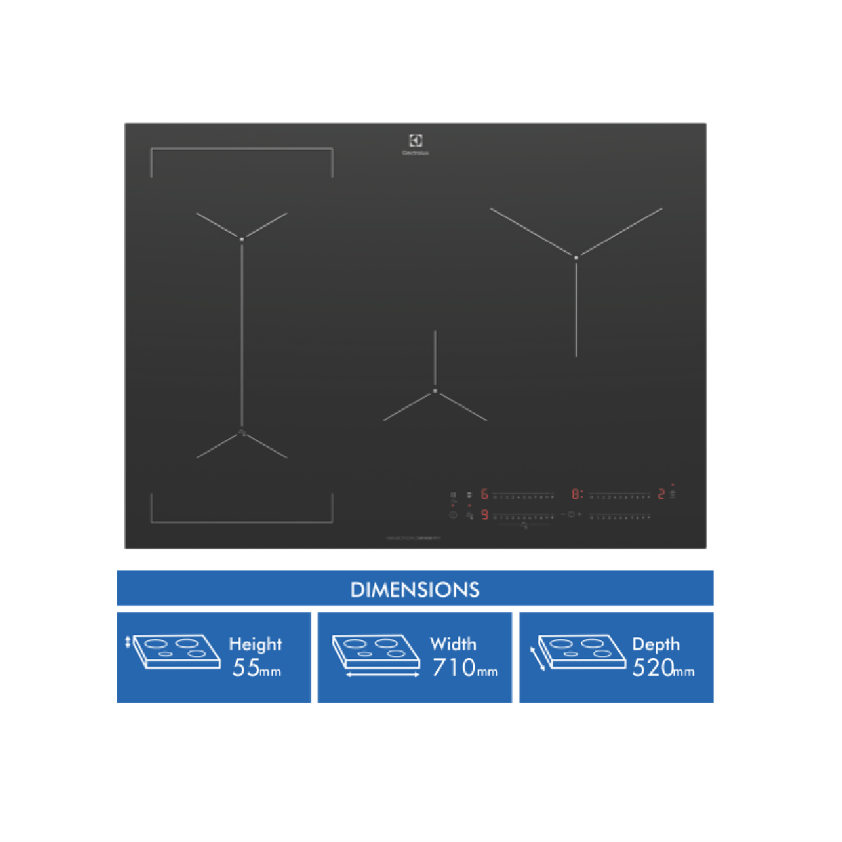 Have the cooking freedom you've always wanted and cook meals fast using minimal energy consumption with this Electrolux 70cm Induction Cooktop EHI745BE; specifically heating the base of your induction-friendly cookware for quicker results. The Bridge function allows you to combine two separate cooking zones to create a single large surface for searing meat before placing in the oven while the x-large MaxiZone delivers a consistent heat so you can cook foods like paella just like a pro using a large paella pan. This Electrolux cooktop even has SenseFry to measure the heat and make automatic adjustments under the pan to maintain the ideal temperature for even cooking. Intuitive touch controls keep up with your every demand by instantly lowering or increasing the heat intensity with every touch of the power controls. Plus each zone has PowerBoost for intense heat in an instant so you'll no longer waste time waiting for water to boil or your pan to heat up. Safety features include residual heat indicators and a child lock. It also has Hob2Hood technology meaning your compatible Electrolux rangehood can automatically switch on when you start cooking also adjusting the fan speed according to the cooking intensity on the cooktop below.