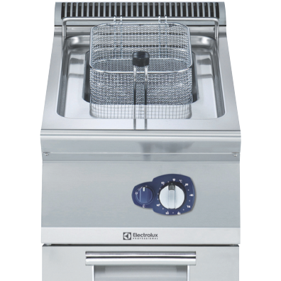 To be installed on height adjustable feet in stainless steel. Two high efficiency 7 kW burners in stainless steel. Suitable for natural gas or LPG. Deep drawn V-shaped well. Oil rains through a tap into a container under the well. Exterior panels in stainless steel with Scotch Brite finish. One piece pressed work top in 1.5 mm thick stainless steel. Right angled side edges to allow flush-fitting junction between units.