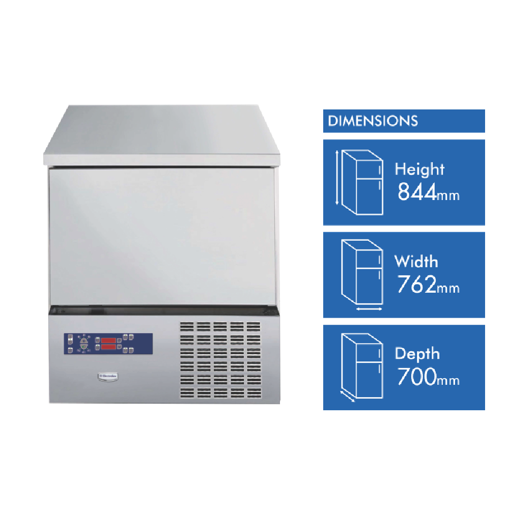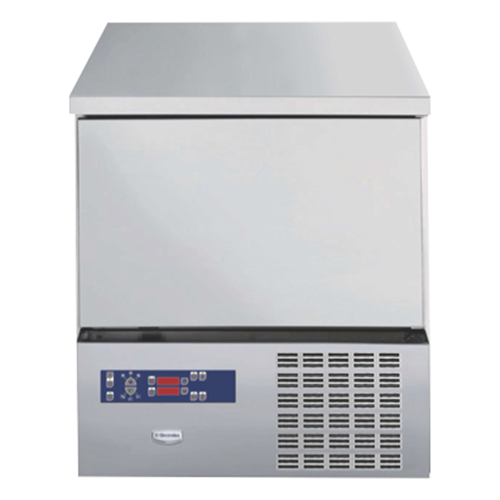 Blast chiller/freezer with digital temperature and time display- For 5 GN 1/1 or 600x400 mm trays- 6 levels available. Usable with 5 GN 1/1 or 600x400 mm trays- Load capacity: chilling 125 kg (UK guidelines); freezing 7 kg (UK guidelines)- Single sensor core probe- Operating air temperature: +3 -41°C- Automatic and manual defrosting- Blast chilling real residual time estimation (A.R.T.E.)- Turbo cooling function- Specific cycles for ice cream- Evaporator with antirust protection- HACCP and Service alarms with data logging- Main components in 304 AISI stainless steel- Internal rounded corners and drain- Cyclopentane insulation (HCFC CFC and HFC free)- Built-in refrigeration unit- R452a refrigerant gas (HCFC and CFC free)- Performance guaranteed at ambient temperatures of 40°C