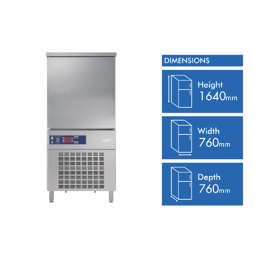 Blast chiller/freezer with digital temperature and time display- For 10 GN 1/1 or 600x400 mm trays- Load capacity: chilling 32 kg (UK guidelines); freezing 28 kg (UK guidelines)- Single sensor core probe- Operating air temperature: +3 -41°C- Automatic and manual defrosting- Blast chilling real residual time estimation (A.R.T.E.)- Turbo cooling function- Specific cycles for ice cream- Evaporator with antirust protection- HACCP and Service alarms with data logging- Main components in 304 AISI stainless steel- Internal rounded corners and drain- Cyclopentane insulation (HCFC CFC and HFC free)- Built-in refrigeration unit- R452a refrigerant gas (HCFC and CFC free)- Performance guaranteed at ambient temperatures of 40°C