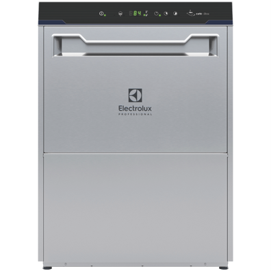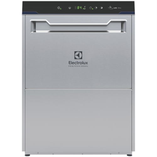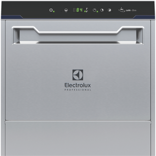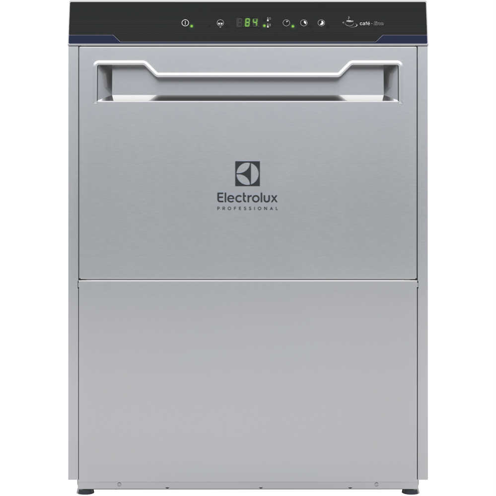 Cafè-line undercounter type hot water rinsing dishmachine using rack dimension of 500*500mm. Electrical characteristics to be 230 volts single phase 50Hz operation convertible to three phase on-site. Washing performance is ensure by a powerful wash pump large capacity wash tank upper and lower revolving spray arms. Soft start wash pump to avoid accidental breakage of crystal wares. Constant rinse temperature and pressure guaranteed by built-in atmospheric boiler and rinse booster pump. Uses 2.5 litres of clean water per final rinse. Powerful boiler heater ensures high productivity even with cold water supply. Three automatic cycles for different types of wares. Double skin insulated counter-balance door. Double skin cabinet. Pressed wash tank with round corners.
