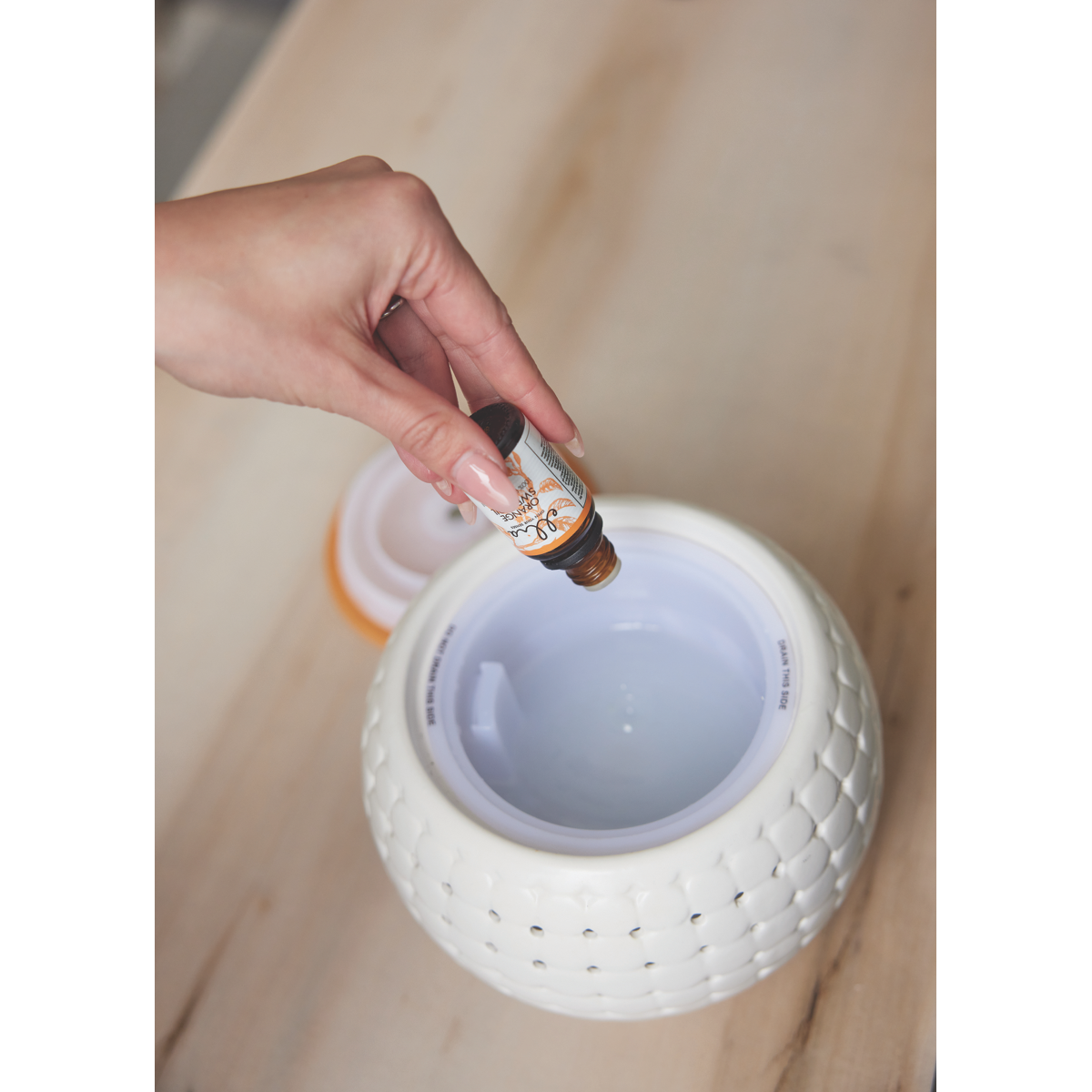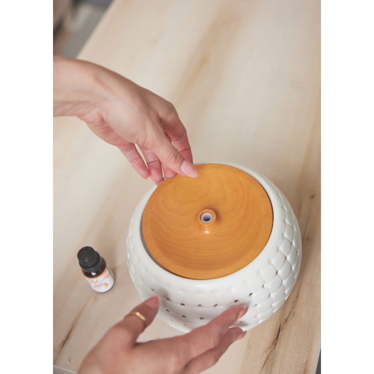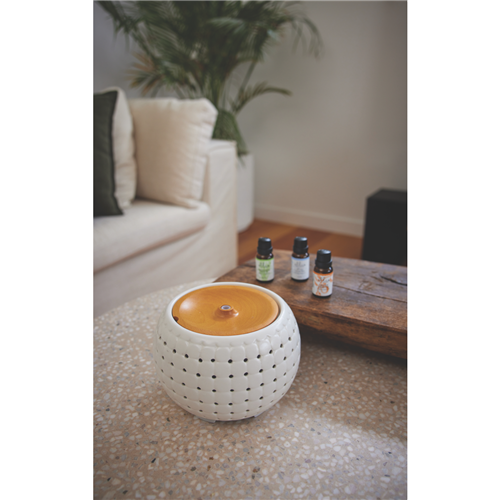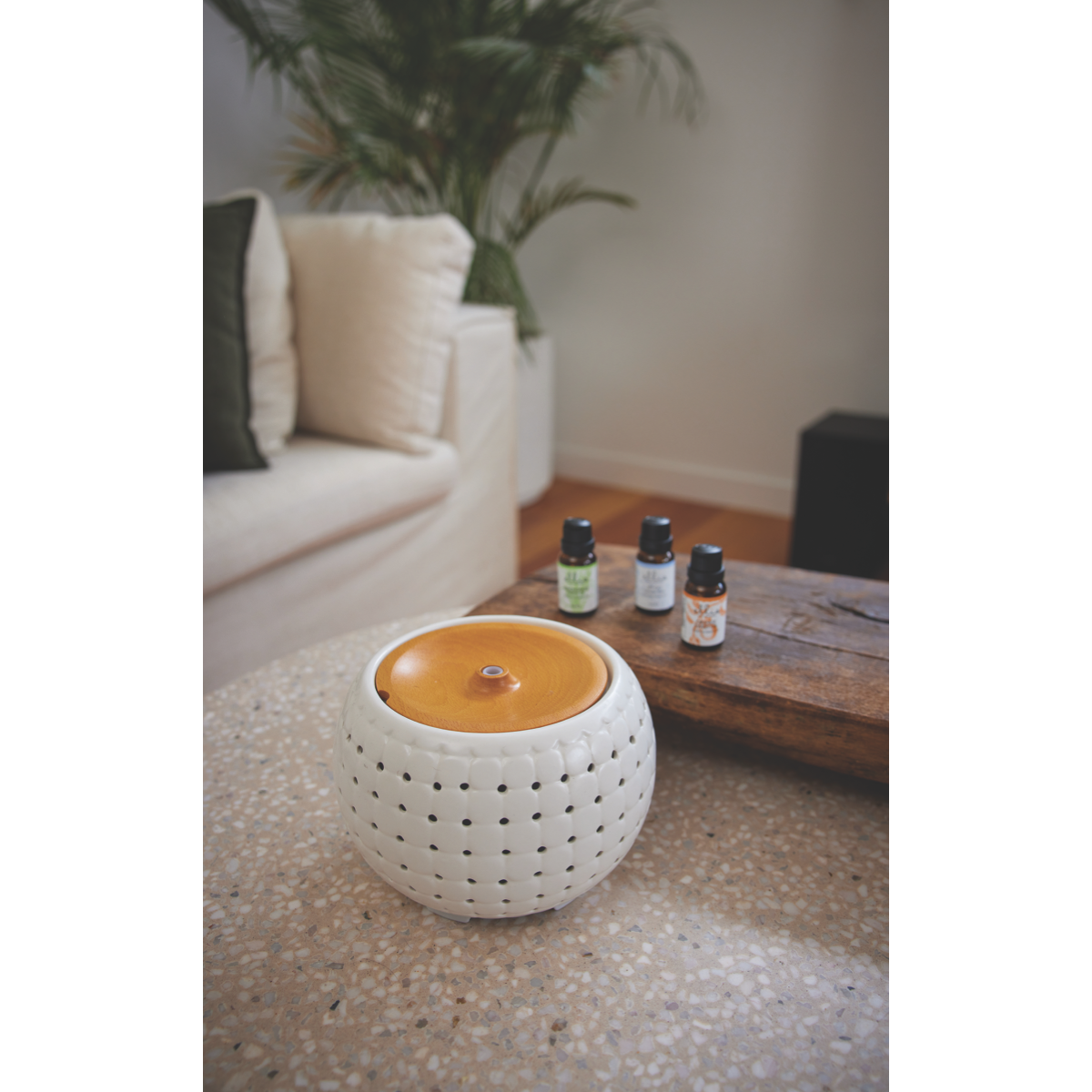 Make your home an oasis of calm with the Ellia Cadence Ultrasonic WiFi Diffuser. This soothing diffuser uses ultrasound waves to disperse essential oils creating a relaxing atmosphere. With WiFi connectivity you can control it remotely through the Ellia app. Choose from uplifting or relaxing sounds with continuous diffusing for up to 10 hours or intermittent diffusing for 20 hours per 200mL tank. The stylish design features a beautiful ceramic cover and wood base. Change the mood with the color changing light. This whisper quiet diffuser adds a touch of tranquility to any room. The manufacturer's part number for this product is ARM-950WT-AU. Bring home the Ellia Cadence Diffuser and experience the relaxing power of aromatherapy.