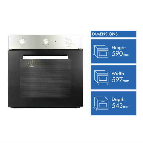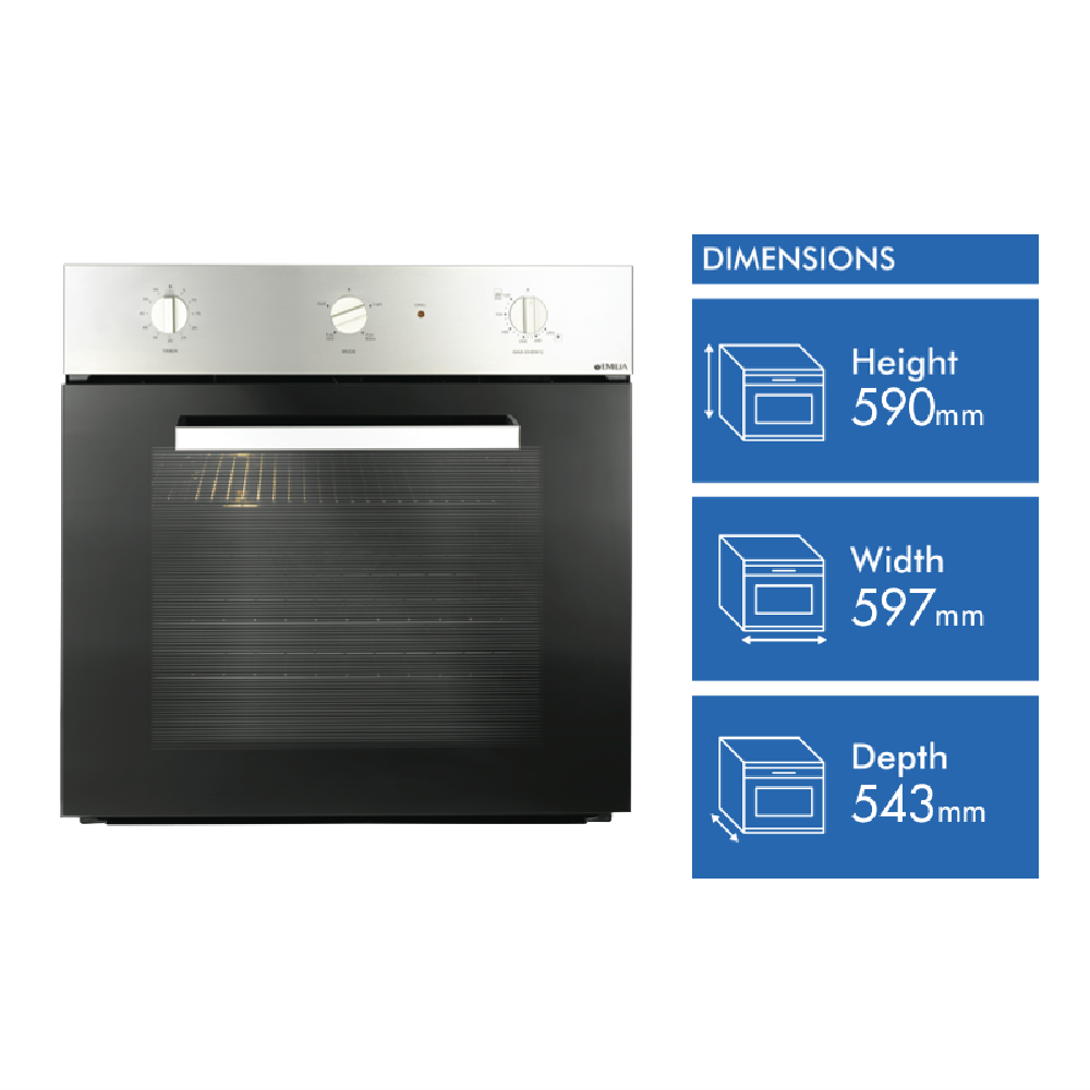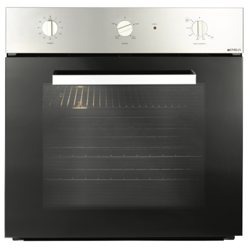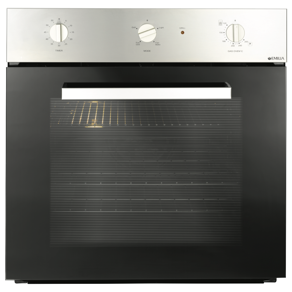 Step into the kitchen of your dreams with the Emilia 60cm Gas Oven. This stainless steel beauty brings high performance cooking right to your countertop with a compact 60cm width that slots perfectly into tight spaces. Whip up delicious family feasts with 4 versatile oven functions including Fan Bake Classic Bake Fan Grill and Electric Grill. The generous 69L capacity accommodates large roasting trays and multiple shelves while the triple glazed door seals in heat for energy efficient cooking. Control your culinary creations easily with control knobs and use the integrated timer to stay on track. This oven comes equipped with 2 side racks 2 wire shelves a grill tray and an insert rack to get you started. The durable titanium enamel and removable inner glass make cleaning hassle-free. With 2300 Watts of power this gas oven brings restaurant quality results right to your home. The manufacturer's part number for this product is EMF61MVI. Bring home delicious dinners and perfect pizzas with the Emilia 60cm Gas Oven today.