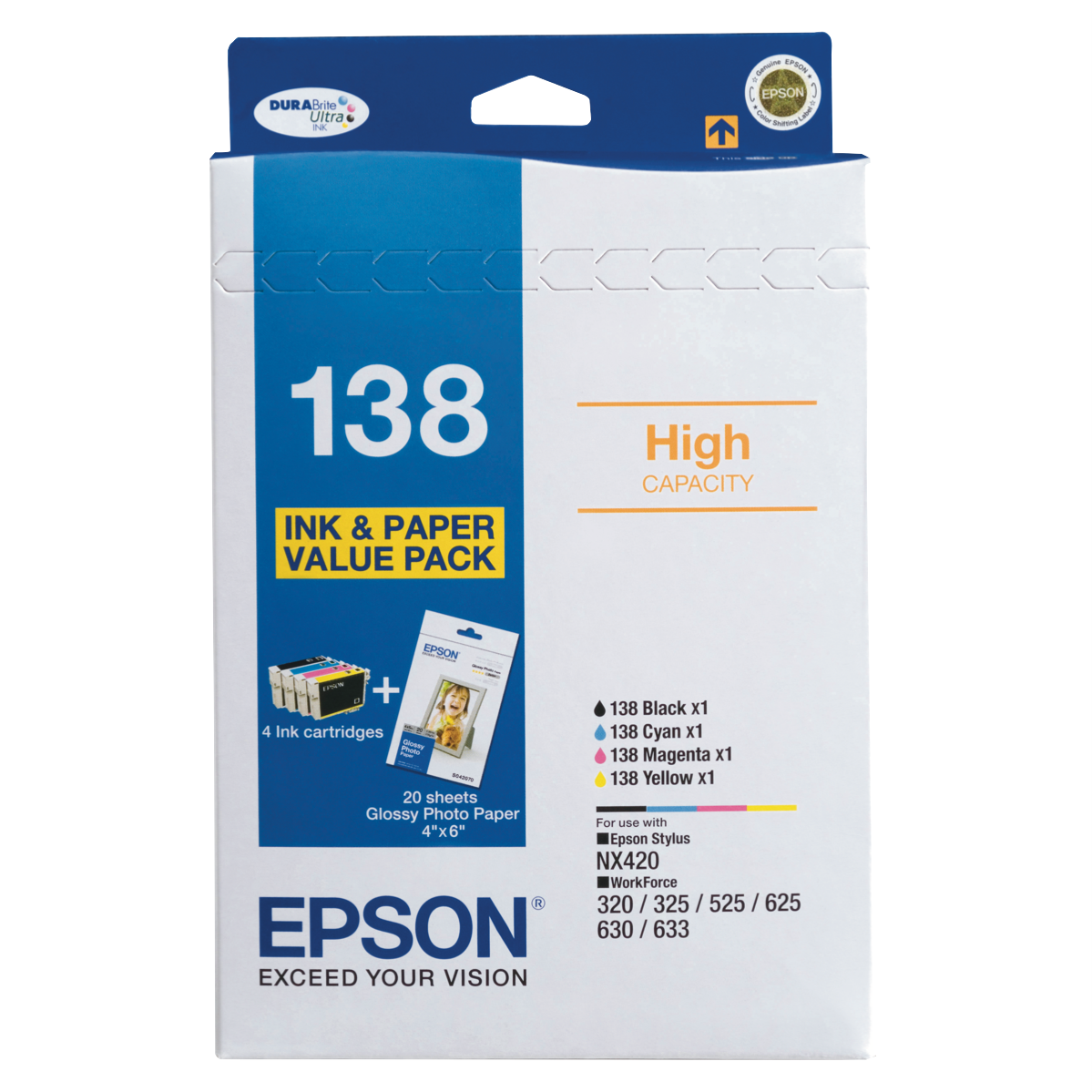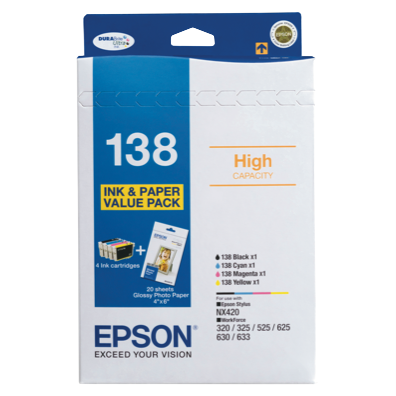 With a value pack of four Epson 138 XL ink cartridges you can say goodbye to constantly running out of ink. This multi-colour cartridge set is designed for select Epson printers including the Stylus NX420 and WorkForce 320 325 525 625 and 630 models providing up to 308 sheets of vivid prints. The convenient high-capacity cartridges reduce the hassle of frequently replacing ink so you can focus on more important things. Bring documents and photos to life with sharp detail and accurate colour reproduction. Epson's DURABrite Ultra ink delivers smudge fade and water-resistant prints that withstand the test of time. For easy high-quality printing at home or the office trust Epson cartridges to deliver reliable performance. With fewer cartridge changes you'll save time and cut down on waste. Discover the difference Epson inks can make for your printouts. The manufacturer's part number for this product is T138695. Check out this Epson ink cartridge pack for your printing needs today.