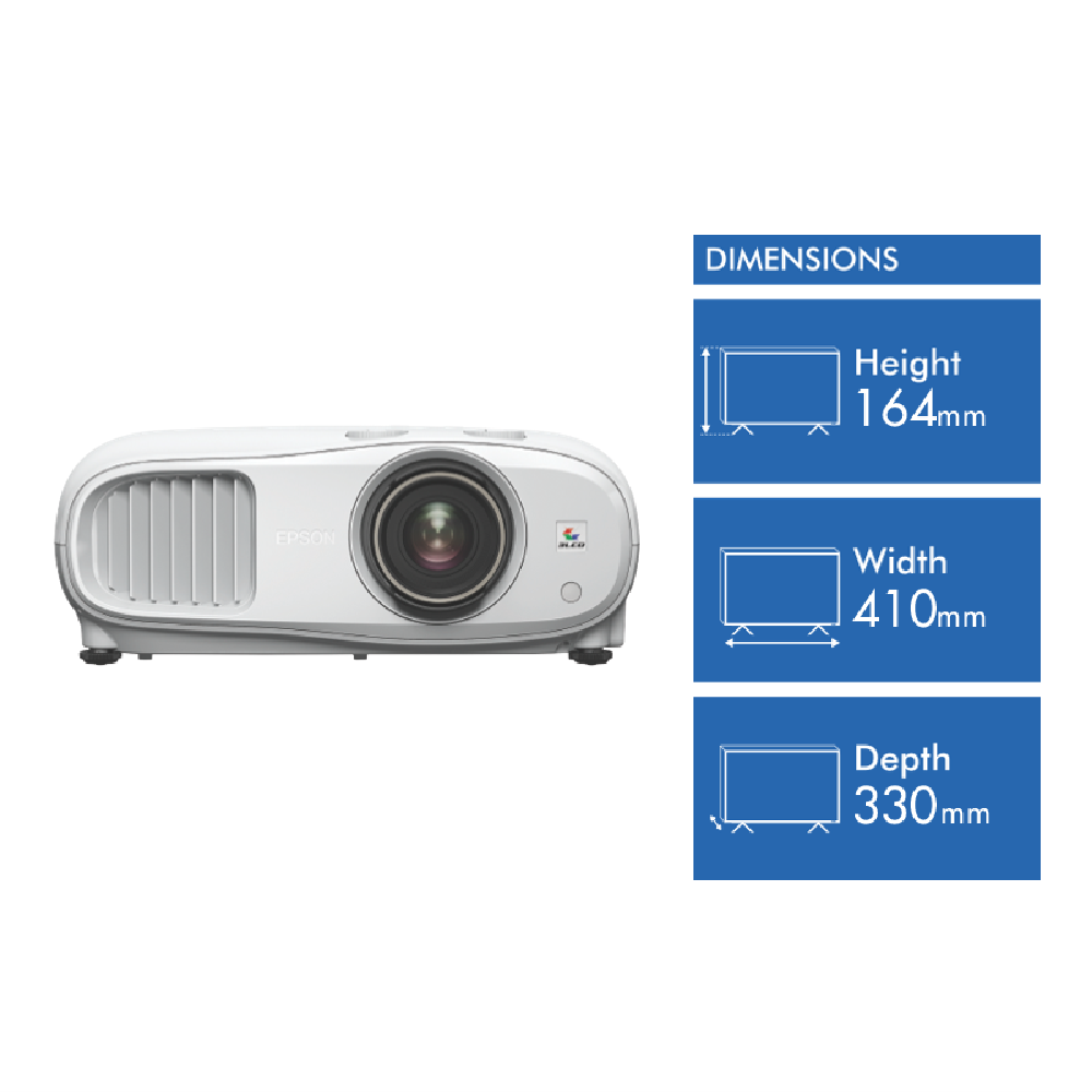 Transform your home entertainment with the Epson EH-TW7100 4K Home Theatre Projector. This sleek projector delivers an immersive cinematic experience with 3840 x 2160 4K Ultra HD resolution and High Dynamic Range (HDR) support for incredible detail and contrast. Equipped with 3000 lumens of brightness and powered by 3LCD technology the EH-TW7100 projects stunningly vivid images up to 500 inches in size. Two built-in 10W speakers provide room-filling audio while features like frame interpolation and 4K image enhancement ensure smooth sharp visuals. Connect your 4K Blu-ray player gaming console or streaming device easily through the two HDMI inputs. Weighing just 6.9kg the compact EH-TW7100 is designed for flexible setup in any room. Control it all easily with the included remote. With incredible 4K image quality powerful audio and smart connectivity the Epson EH-TW7100 Home Theatre Projector makes it easy to create an immersive home cinema. The manufacturer's part number for this product is EH-TW7100. Bring the big screen experience home today.