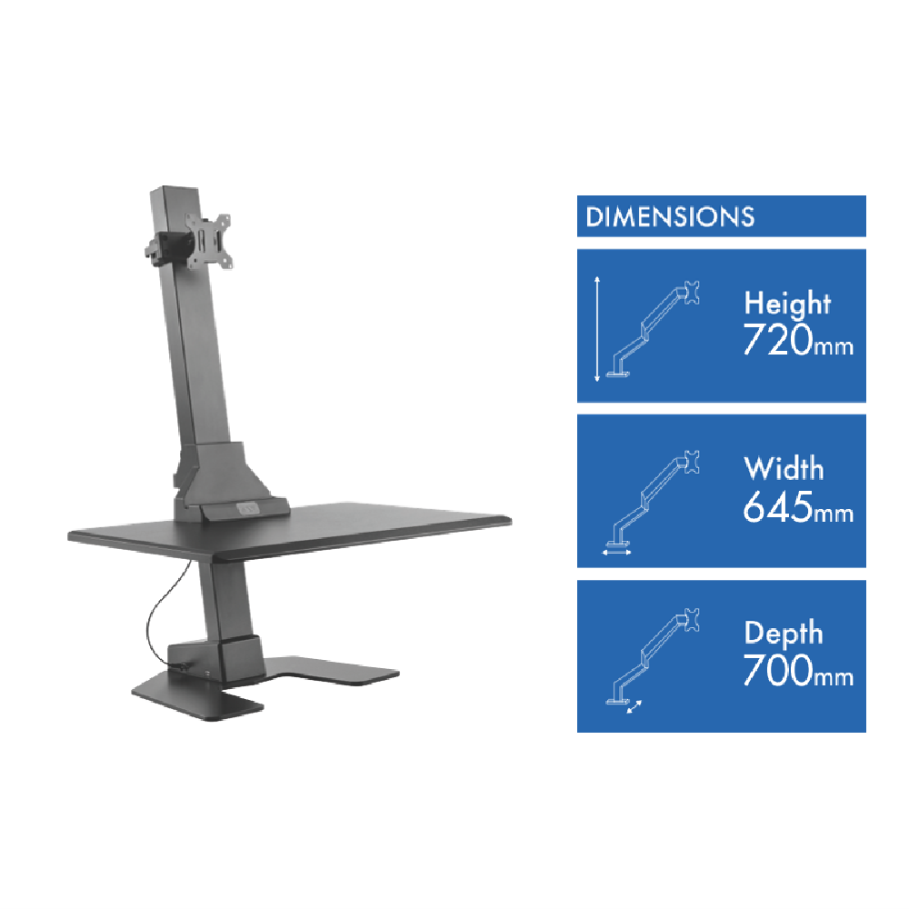 Elevate your productivity and comfort with the Ergovida Monitor Electric Workstation in sleek black. This height-adjustable monitor mount frees up precious desk space while promoting proper ergonomic posture. Simply raise or lower the arm to find your ideal viewing position. The gas spring hovering design allows effortless adjustments of up to 30cm so you can sit or stand throughout the day. The durable C-clamp and grommet base options provide a sturdy foundation for screens up to 27 . Tilt swivel and rotate your display for the perfect viewing angle. The internal cable management keeps wires tidy and out of sight. With its smooth and silent adjustments the Ergovida Monitor Electric Workstation promotes productivity and wellbeing. Experience the flexibility to alternate between sitting and standing positions for improved comfort and energy. The manufacturer's part number for this product is EDT10-T01B. Transform your workspace today.