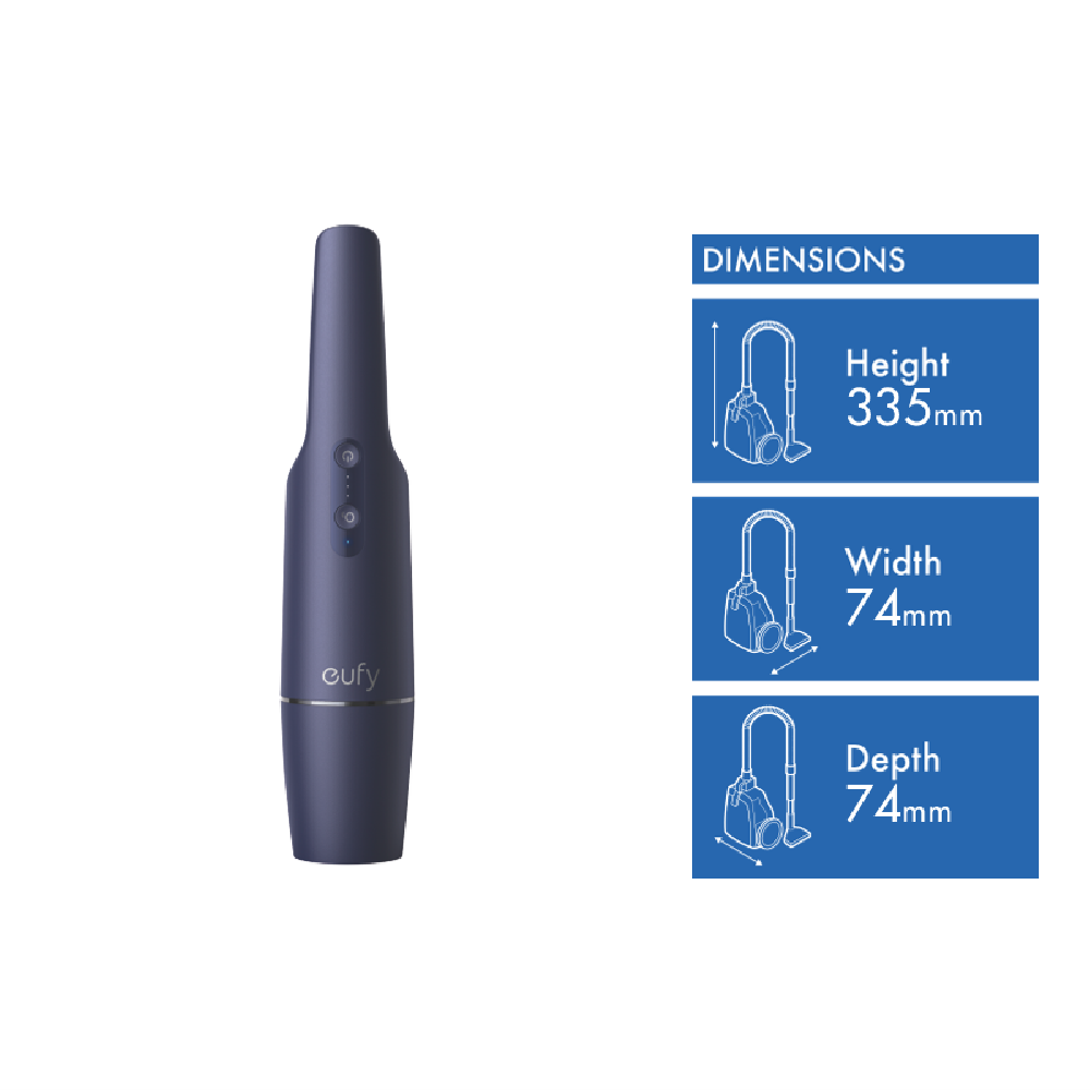 Clean and clear your everyday surfaces with the effortless eufy Pure Air Handheld Vacuum Blue. This lightweight 0.60kg handheld vacuum packs 5000Pa of suction power into a compact 335 x 74 x 74mm frame to lift dust and debris from floorboards tiles carpet seats chairs desks and more. The included 2-in-1 combo tool tackles both crevices and upholstery while the bagless washable filter cuts down on costs. Recharge via USB when power runs low. With up to 15 minutes of fade-free suction per charge this cordless vacuum makes quick work of messes in your home or car. At just 74mm wide it's easy to store and whip out when unexpected spills occur. The long-lasting lithium polymer battery stands up to repeated use so you can keep your spaces spotless for years to come. Rest assured with the included 1 year manufacturer's warranty. Light portable and packed with power the eufy Pure Air Handheld Vacuum Blue brings effortless cleaning anywhere. Order yours today.