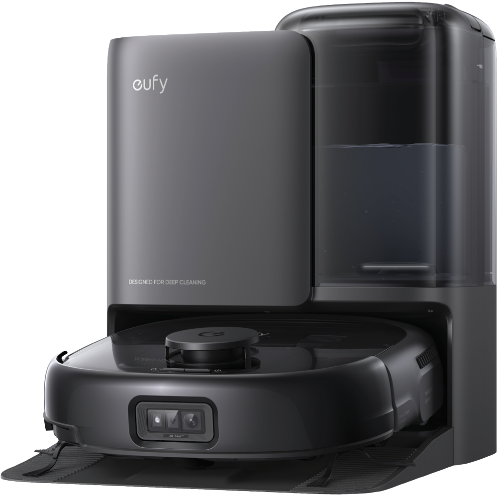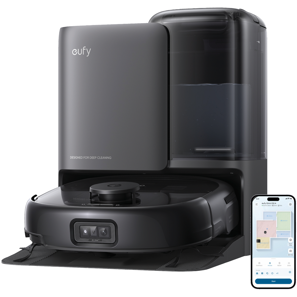 The eufy E25 Omni Robot Vacuum and Mop Combo features a powerful HydroJet System with 20000 Pa turbo suction zero-tangling technology and corner-to-edge deep cleaning all supported by an auto all-in-one station.