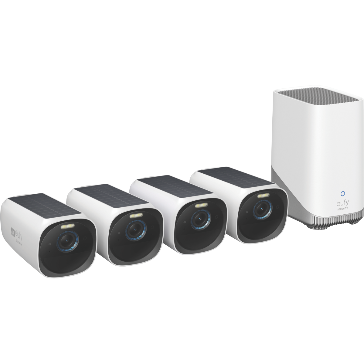 Shore up your properties security with the Eufy Security Eufycam 3 4 Pack with Homebase 3 T8873TW1. See it all with 4K Ultra HD quality able to detect a licence plate clearly at up to 10m away. Keep watch with a built in starlight sensor and motion sensing spotlight for maximum colour and brightness in the night. Stay online with the built in 13000mAh battery lasting up to 365 days also charging via direct sunlight further reinforced by IP67 weatherproofing against dust and rain. Employ BionicMind AI facial recognition so friends and family avoid triggering your alerts and filter alarms get daily security briefings and more with no subscription or monthly fees. Communicate via two way audio Google Assistant and Amazon Alexa smart home voice assistants and tap in anytime with the HomeBase 3. Expand your storage up to 16TB (sold separately) for even more recording capability.
