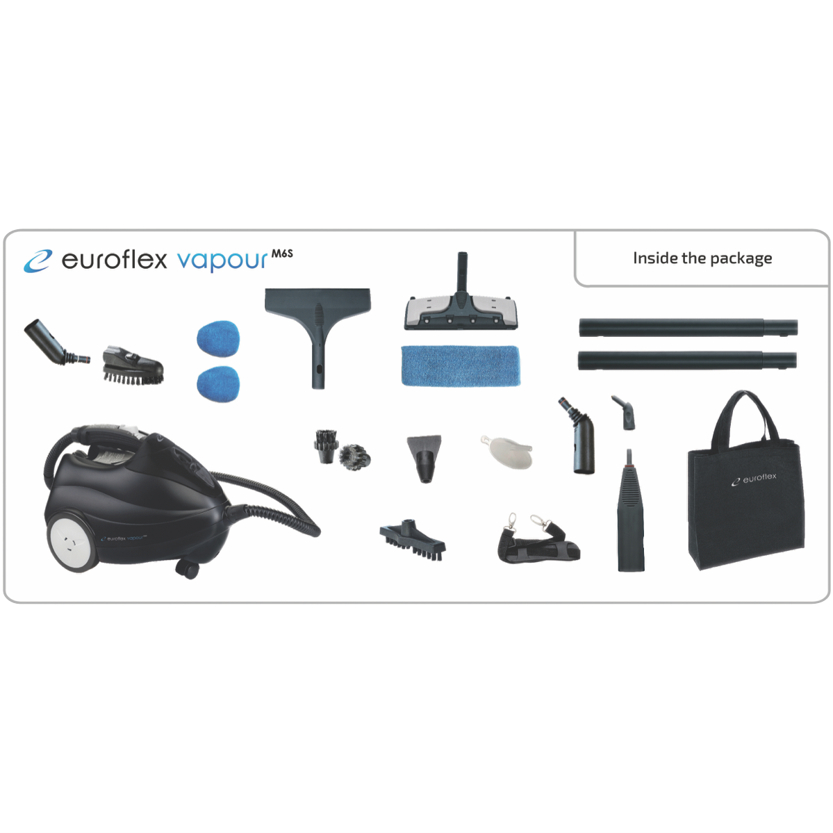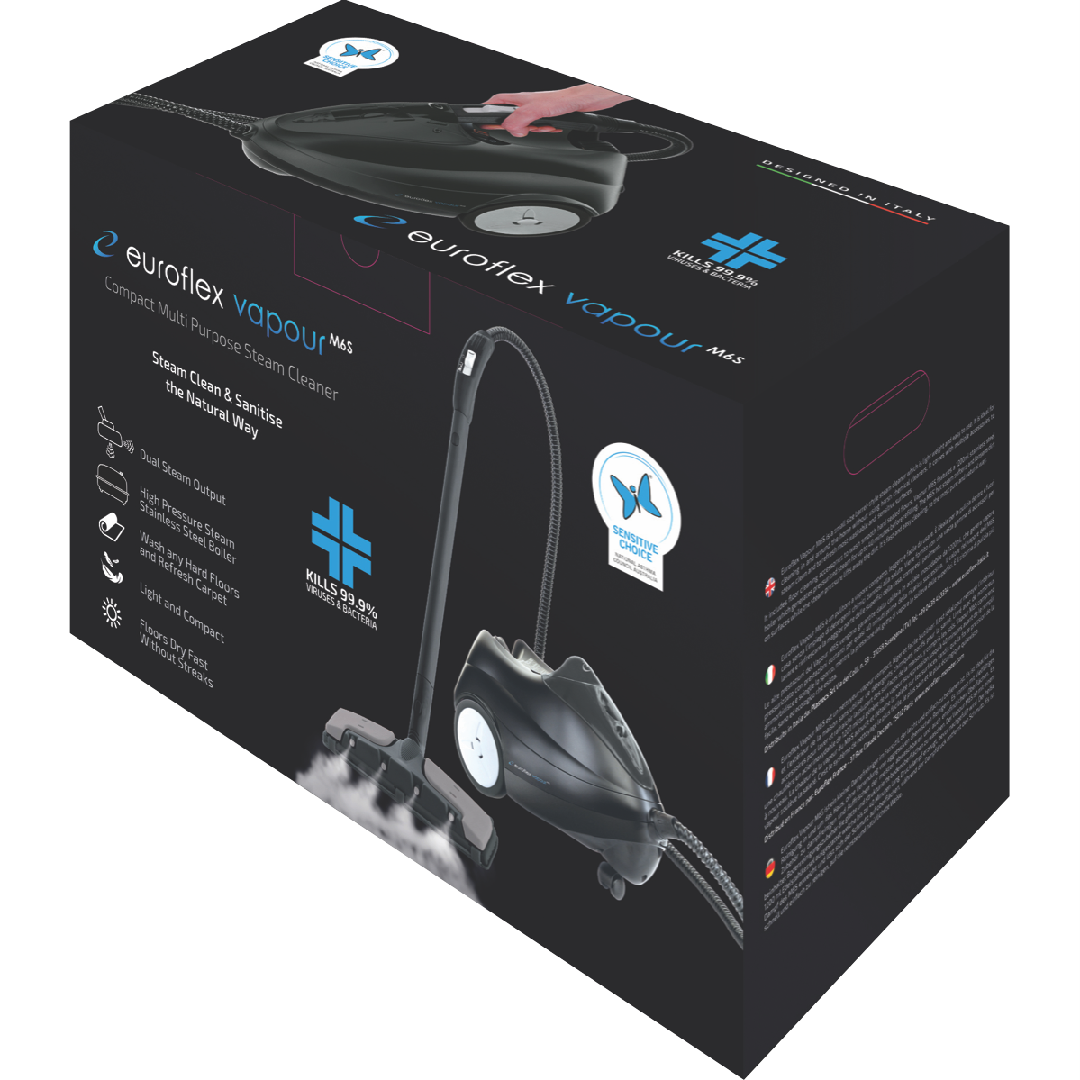 Banish germs and grime with the powerful Euroflex Vapour-M6S Steam Cleaner. This steam mop kills 99.9% of viruses and bacteria for a deeper clean. The generous 1200ml tank capacity provides up to 45 minutes of steam cleaning on hard surfaces. Tackle every room with the 6 metre power cord. Sensitive Choice approval makes this steam mop ideal for asthma and allergy sufferers. The continuous steam helps loosen and lift dirt grease and grime from tiles sealed hard floors benches windows and more. Enjoy sparkling clean floors without using harsh chemicals. The easy-to-maneuver design makes quick work of cleaning bathrooms kitchens and other areas. Simply fill with water plug in and start steaming away dirt. The two steam settings let you customize the cleaning power. Get into corners and tight spaces with the flexible steam head. Say goodbye to scrubbing and elbow grease. Transform your home with the power of steam. Enjoy floors and surfaces that look freshly cleaned. This steam cleaner comes with a 2 year warranty for peace of mind. The manufacturer's part number for this product is 3330272. Consider bringing home the Euroflex Vapour-M6S Steam Cleaner for easy chemical-free cleaning.