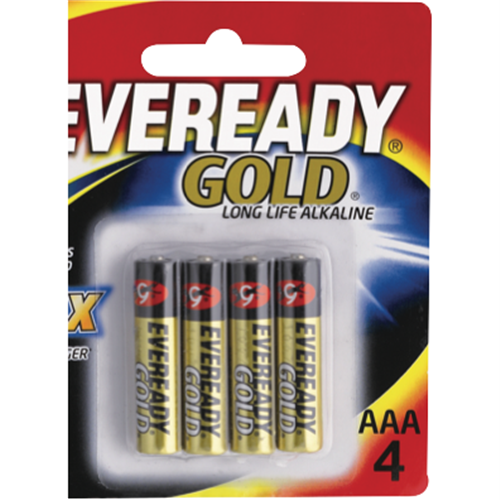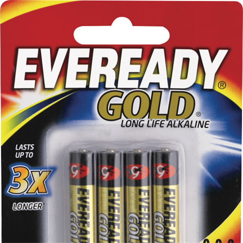 Power up your devices with the long-lasting performance of Eveready Gold AAA Batteries. These premium batteries provide reliable power for everything from remote controls to toys flashlights and more. The 4-pack of AAA batteries is ideal for households that go through batteries quickly. Eveready Gold batteries deliver up to 10 hours of continuous use in high drain devices giving you the confidence that your devices will keep working when you need them. Their sustained power output makes them a versatile choice for any AAA battery-operated device. Plus their leak-resistant construction protects your valued electronics. Bring reliable and long-lasting battery power into your home with the 4-pack of Eveready Gold AAA Batteries. The manufacturer's part number for this product is E300577300. Check out this battery pack today for your power needs.