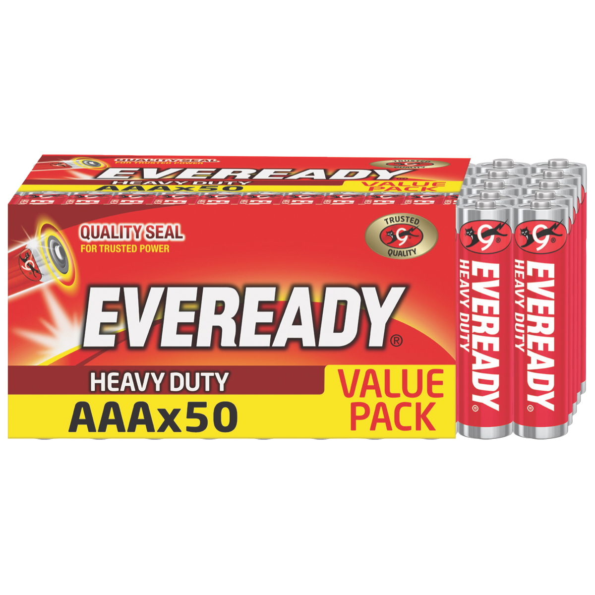 Power up your devices with long-lasting energy. The Eveready Heavy Duty AAA 50 Pack provides reliable power for all your gadgets and gizmos. These non-rechargeable batteries deliver dependable performance when you need it most. With 50 AAA batteries in each pack you'll have plenty of power on hand for toys flashlights remotes and more. The Eveready name means trusted quality. Enjoy hours of uninterrupted playtime and usage with batteries designed to last. From power-hungry devices to low-drain ones these heavy duty AAAs offer an affordable solution. The compact AAA size fits conveniently into any device that requires it. Avoid the frustration of unexpected battery failure with Eveready's reliable construction and leak-resistant design. Give your gadgets the consistent power they crave. This 50 pack makes powering a variety of devices easy and convenient. The manufacturer's part number for this product is E301515500. Invest in long-lasting energy today.