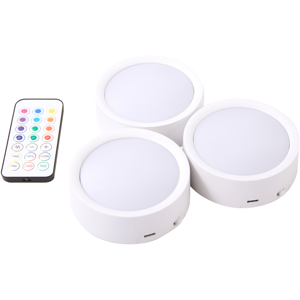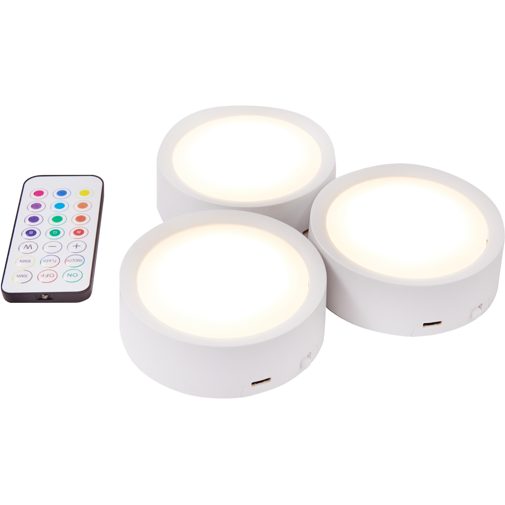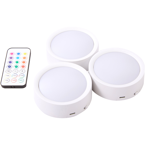Illuminate dark spaces easily with this three-pack of rechargeable LED disc lights. Each compact white light delivers 35 lumens of brightness perfect for hallways closets or under cabinets where you need gentle illumination. The convenient design can be charged up to 1000 times giving you plenty of use before needing replacement. Simply place these white disc lights wherever you need extra visibility without complex installation. Comes with a 1-year manufacturer's warranty. Model EV378.