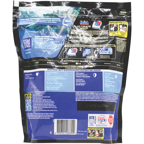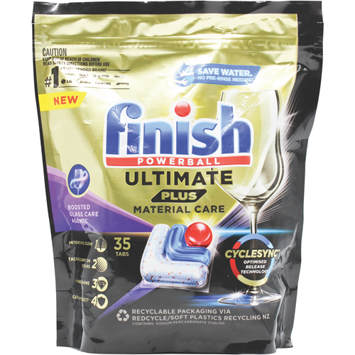 Make dishwashing easier with these Finish Ultimate Plus Dishwasher Tablets. This 35-pack gives you plenty of cleaning power for multiple loads so you won't need to restock anytime soon. The oxygen-based bleaching agent tackles tough food stains while leaving your dishes sparkling clean. These tablets are designed to deliver both cleaning performance and a brilliant shine handling everything from everyday glasses to pots with baked-on food. No pre-rinsing needed - just pop a tablet in and let it do the work. Part number: 3248330.