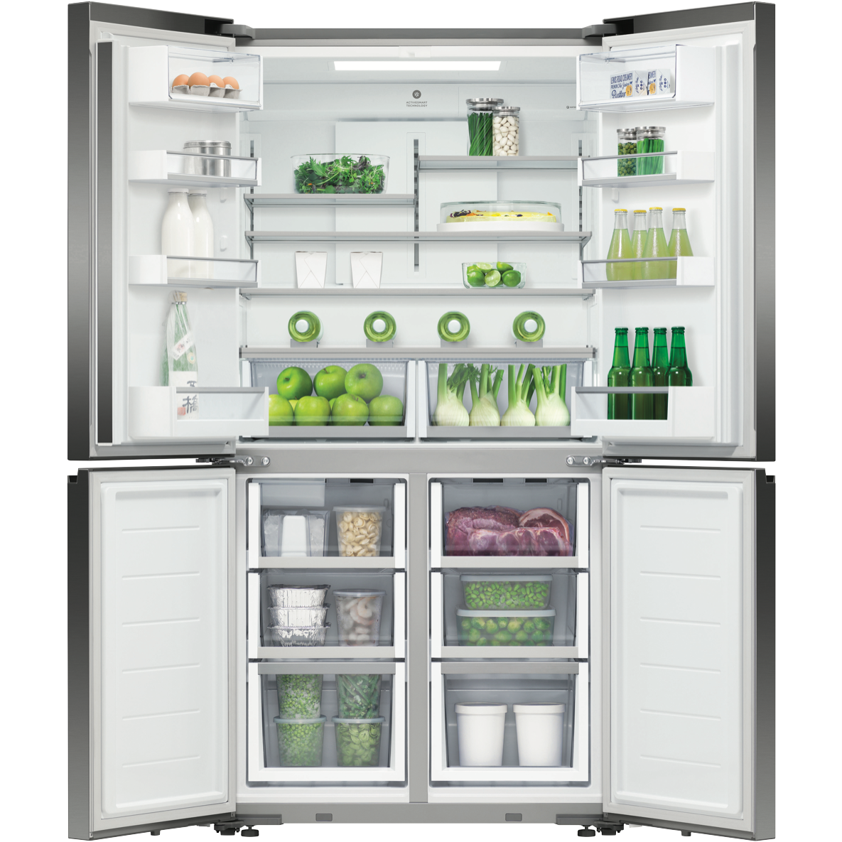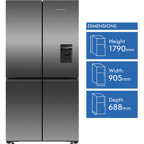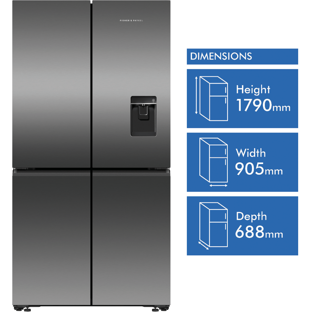 Step up to a more spacious way of refrigeration with the Fisher & Paykel 538 litre Quad Door French Door Refrigerator in classic Black stainless steel. Boasting a generous 538 litre total capacity this quad door fridge provides ample storage for the weekly shop and extras. The sleek Black stainless steel finish adds a modern touch to your kitchen. Inside you'll find 341 litres of fridge space and 197 litres of freezer capacity providing room for all your fresh and frozen favourites. Dual hinged doors give easy access from either side. The auto ice and water dispenser eliminates refilling ice trays and makes filtered water readily available with just the press of a lever. Rated an energy efficient 4 stars this large capacity fridge helps cut electricity costs. Part of Fisher & Paykel's premium Series 7 range this quad door refrigerator offers advanced cooling technology and flexible storage solutions. With a width of 905mm height of 1790mm and depth of 688mm it fits most kitchen spaces while making an elegant style statement. Bring home the convenience of more space for food and drinks with the Fisher & Paykel 538 litre Quad Door Fridge. The manufacturer's part number for this product is RF605QNUVB1. Take a closer look at this Fisher & Paykel refrigerator for your kitchen today.