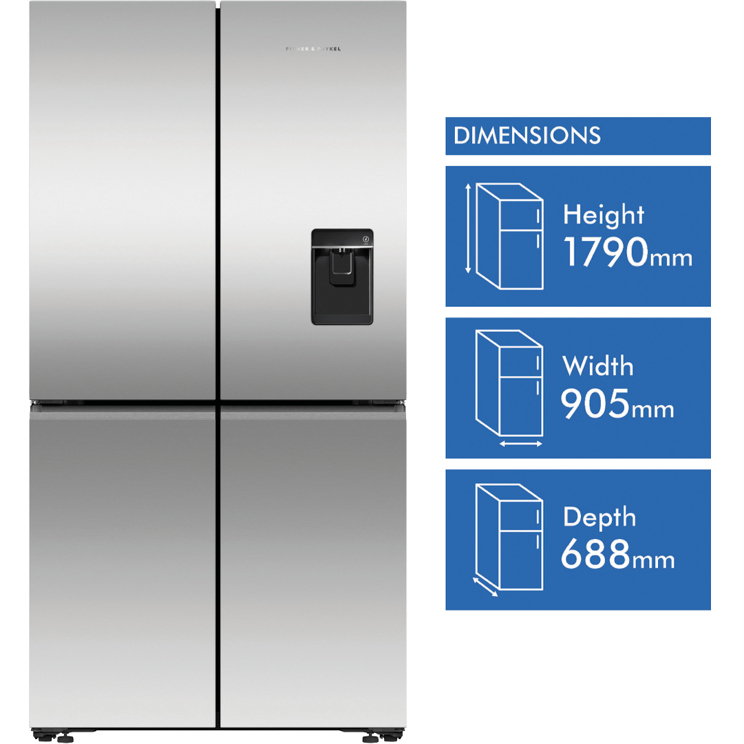 Enjoy the peace of mind of secure food storage with the Fisher & Paykel 538L Quad Door Refrigerator. This French door fridge boasts an impressive total capacity of 538 litres with a spacious 341 litre fridge compartment and ample 197 litre freezer. Its sleek stainless steel finish and silver colouring will complement any modern kitchen aesthetic. The four convenient doors provide easy access from multiple angles - perfect for busy family life. The ice and water dispenser delivers refreshing chilled water and ice on demand. ActiveSmart technology automatically adjusts cooling based on usage patterns ensuring optimum temperature control and energy efficiency. The variable temperature zone allows you to customize cooling for different foods.Additional handy features include auto ice maker and door alarms. Its energy rating of 4 stars means this fridge meets energy efficiency standards for electrical appliances in Australia and New Zealand. As part of the Fisher & Paykel Series 7 range you can expect the superior build quality and innovative design that Fisher & Paykel is renowned for. With dimensions of 905mm width 1790mm height and 688mm depth this fridge will fit most standard kitchen spaces. The manufacturer's part number for this product is RF605QNUVX1. Bring the convenience of quad-door refrigeration into your home with the Fisher & Paykel 538L model.