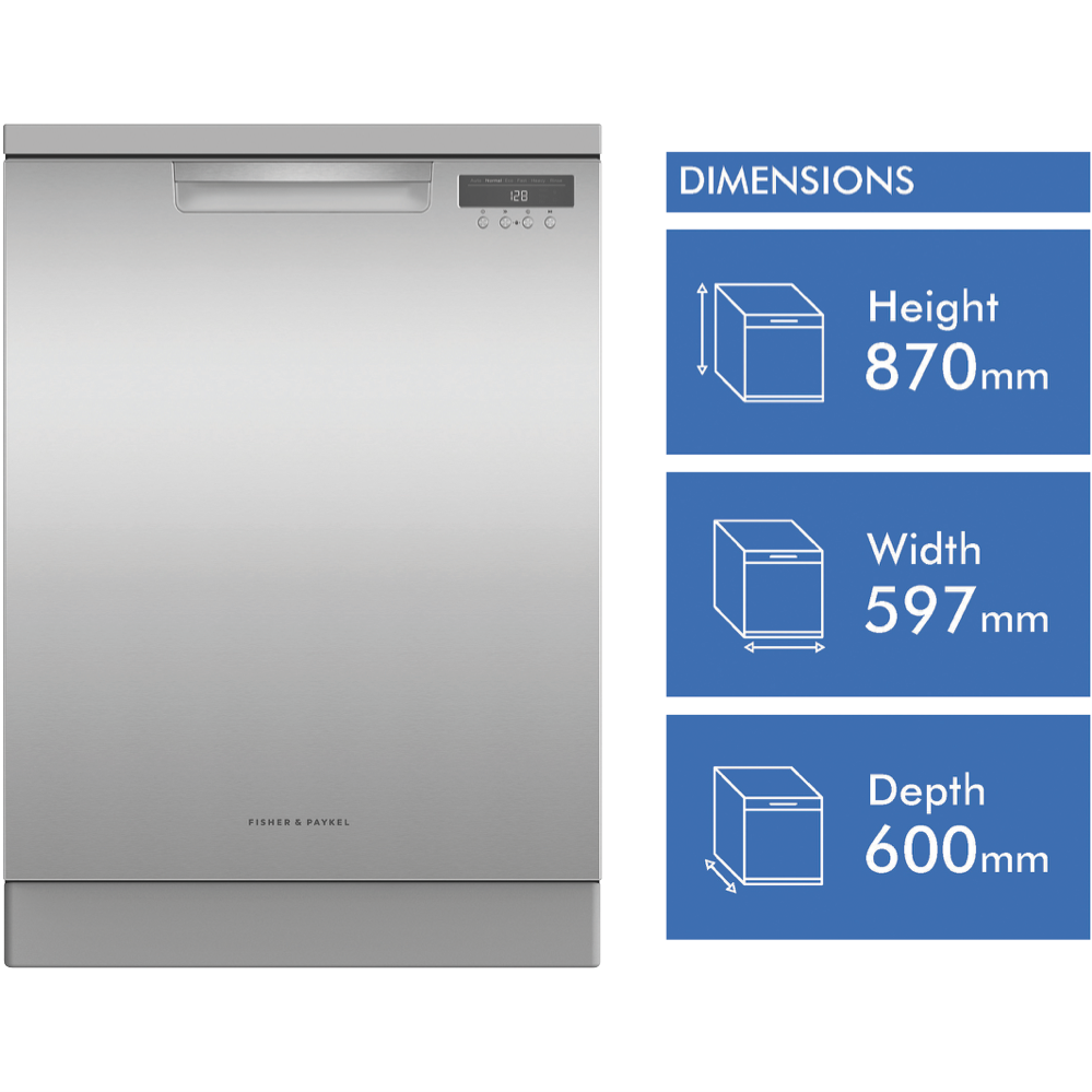 This Fisher & Paykel dishwasher's 14 place setting capacity helps you effortlessly keep lots of dishes clean. It has a 5 star WELS water rating so you can reduce water consumption. Also place it in a convenient location with the Fisher & Paykel DW60FC1X1's free standing design. It has baskets and racks. The Fisher & Paykel dishwasher has a 3.5 star energy rating. Also it features a 597mm width an 870mm height and a 600mm depth. The dishwasher features a stainless steel finish. It's a smart pick for finishing your dish washing for the night.