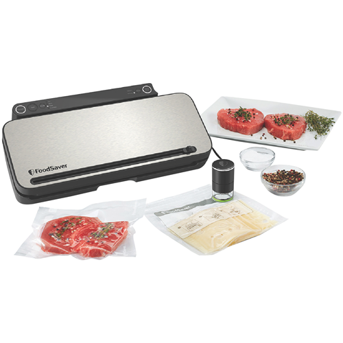 The Premium All-in-One FoodSaver with 5 food settings to help you preserve prep & cook; also combines the power of a heat sealer with the convenience of a handheld vacuum sealer for containers and zipper bags. Try the sous vide setting to seal food for delicious sous vide cooking the pulse setting for delicate foods the marinate setting for flavouring minutes and the dry & moist settings for an airtight seal regardless of the type of food. The powerful vacuum creates a commercial quality air-tight seal to keep food fresh up to 5X longer and prevent freezer burn compared to ordinary storage methods.