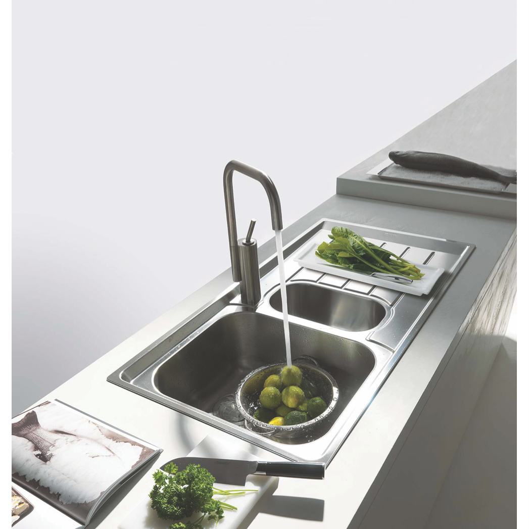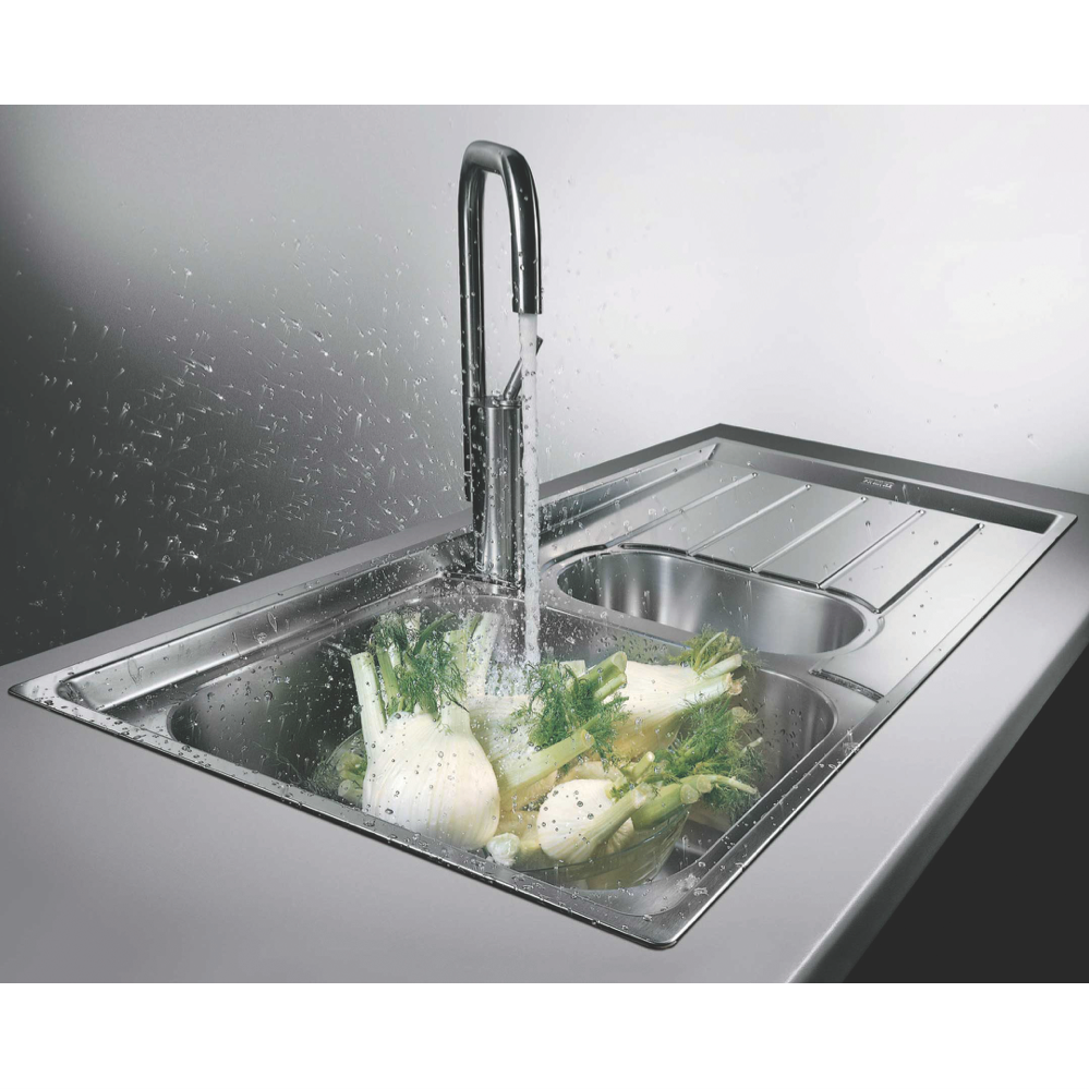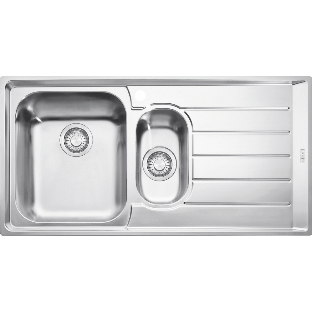 Bring sleek modern style and efficient functionality to your kitchen with the Franke Neptune 1&1/4 bowl right hand drainer stainless steel sink. This top mount double bowl sink is crafted entirely from robust and durable stainless steel for long lasting performance. With its spacious 26L main bowl and handy 28L auxiliary bowl you'll have ample room for washing dishes preparing meals and more. The main bowl measures a generous 420mm high by 360mm wide by 190mm deep while the smaller second bowl is 302mm high by 165mm wide by 130mm deep. Installation is a breeze thanks to the 984 x 494mm cut-out size. Rated for 500 kPa this sink can withstand years of daily use. The right hand drainer configuration provides an ergonomic solution for rinsing and drying. With 1 tap hole you can customize your faucet setup. Semi integrated waste outlets and an integrated sealing strip ensure a seamless look and prevent leaks. Give your kitchen a stylish facelift with the versatile Franke Neptune double bowl stainless steel sink. The manufacturer's part number for this product is NEX651RHD. See how this sink can enhance your culinary workflow today.