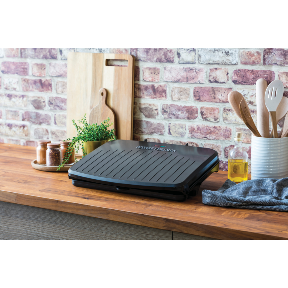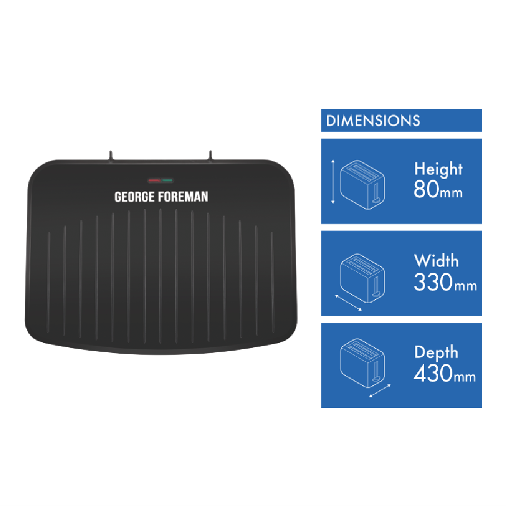 Sizzle up juicy burgers steaks and veggies with ease using the George Foreman Fit Grill Large. This spacious grill boasts durable non-stick plates that make flipping meats and cleaning a breeze. With rapid 6 minute preheating you can satisfy cravings 160% faster than conventional grills. The adjustable rear foot lets you cook meats at an angle to extract up to 42% of fat for healthier meals. Dual indicator lights signal when the floating hinge grill reaches optimum temperature so you always cook meats perfectly. At just 80mm in height the vertical storage design cuts down on 25% of countertop clutter. With a 1 year warranty and manufacturer's part number GFF2022 this is the grill for effortless dinnertimes. Experience the difference a George Foreman grill makes in your kitchen today.