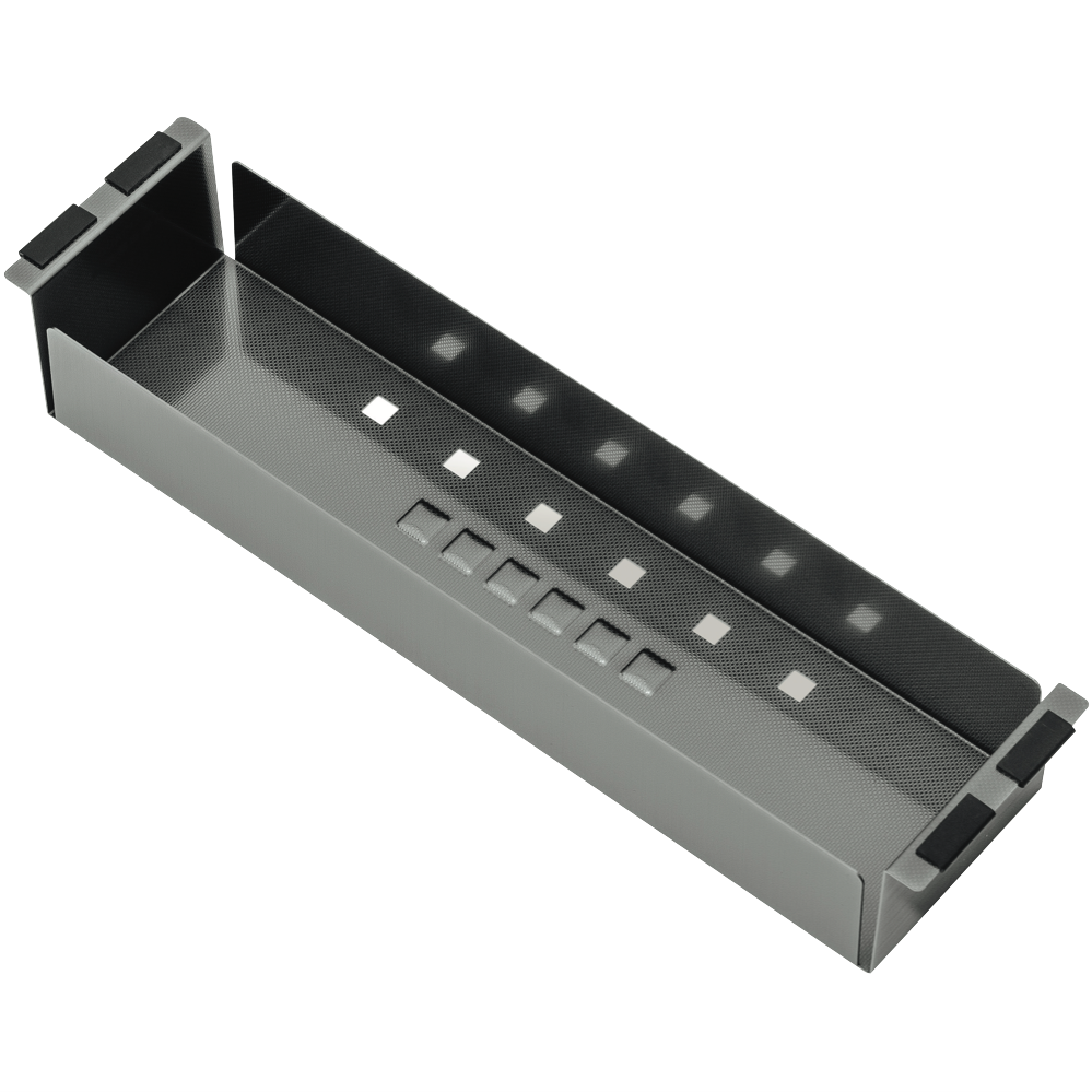 This stainless steel Hafele Squareline Colander brings sleek modern style to your kitchen sink. Crafted from durable stainless steel this colander features a stylish square design with an open weave that allows water to drain quickly while retaining food. The generous 414mm x 100mm x 70mm size provides ample space for rinsing fruits vegetables and more. With its gun metal finish that resists rust and corrosion this colander is built to last through years of regular use. The open weave allows maximum water drainage so you can thoroughly rinse produce while the stainless steel construction ensures this colander will maintain its lustrous finish. Designed for use in a range of kitchen sinks this handy accessory simplifies food prep tasks like washing veggies or draining pasta. Check out this modern durable colander to add function and style to your kitchen. The manufacturer's part number for this product is 567.34.953. Take a closer look at this stylish stainless steel colander for your kitchen today.