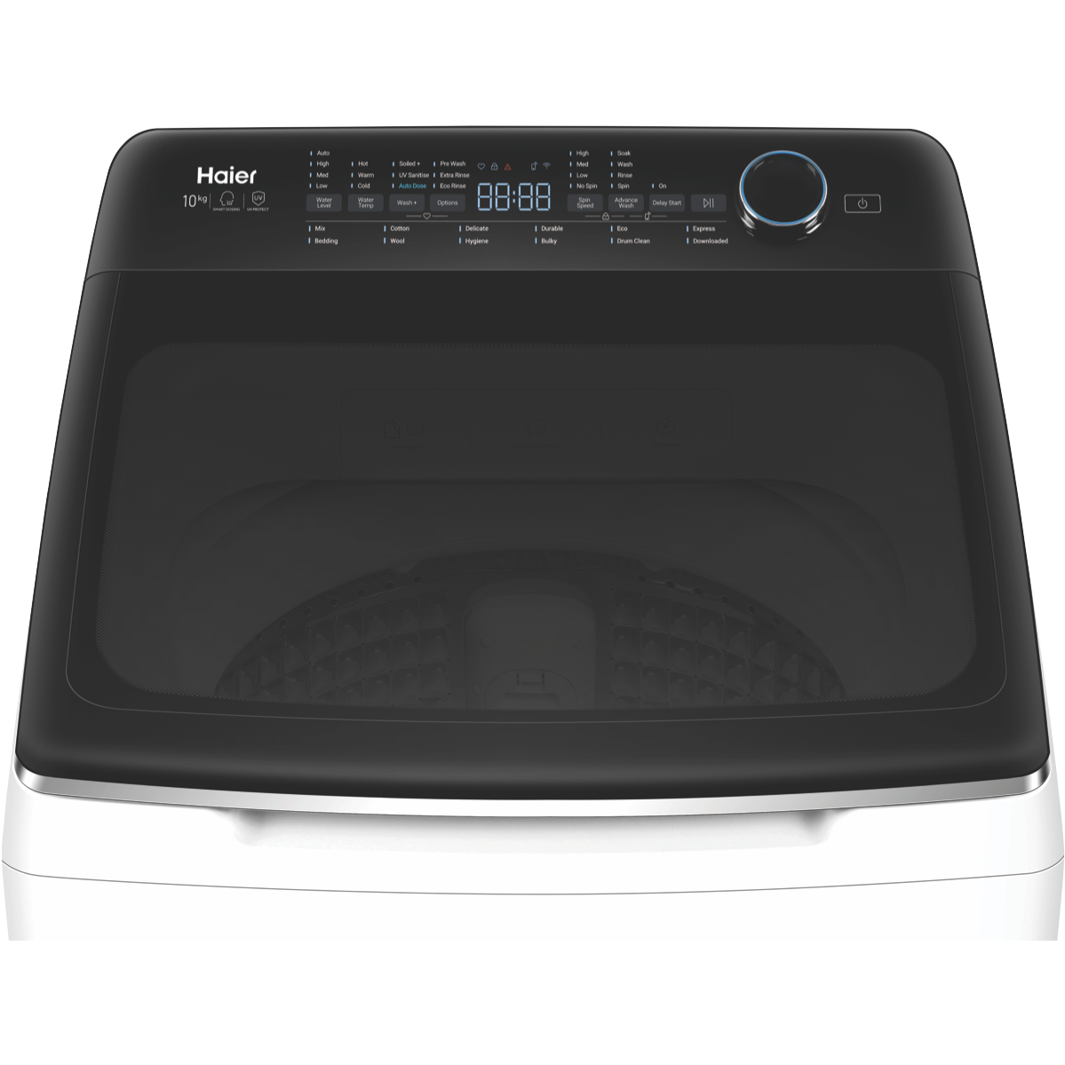 Additional Features UV Protect, Auto out of balance correction, Auto Dose, Child lock, Double lint filter, Front levelling feet, No central post agitator, Progress indicator, Soft Close Lid, Start/Pause button, Tempered glass lid, Time to go