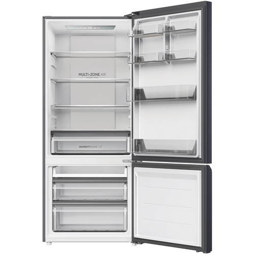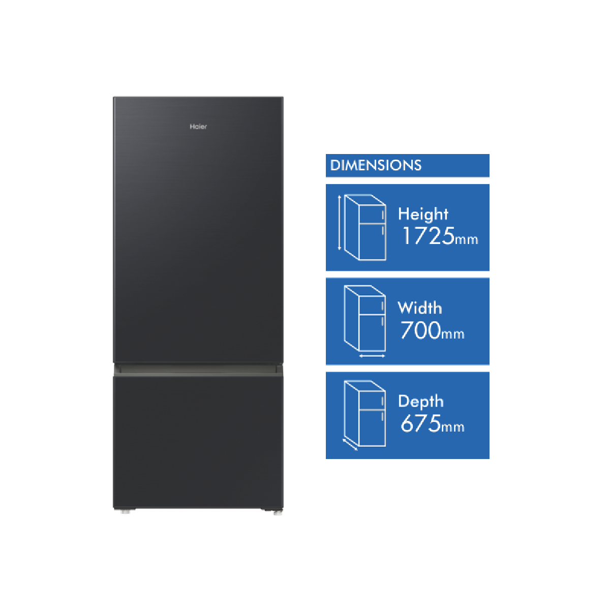 Bring home spacious and flexible refrigeration with the Haier 433L Bottom Mount Refrigerator. This fridge comes with a sleek black finish that will seamlessly blend into your kitchen decor. The generous 433 litre total capacity includes a large 321 litre fridge compartment and a 112 litre freezer providing ample storage solutions for all your fresh and frozen foods. The bottom mount design ensures easy access to frequently used fridge items while keeping frozen foods within easy reach below. Dual hinged doors and reversible door swing cater to both left and right opening preferences. Interior features like Humidity Zone Multi-Zone Air and Super Freeze ensure optimised conditions for storing all types of food. The 5.5 star energy rating significantly reduces running costs while the fingerprint resistant finish simplifies cleaning. With separate temperature controls for the fridge and freezer you can customise cooling as needed. Recessed handles and a smooth black finish give this refrigerator a minimalist modern look.At 700mm wide 1725mm high and 675mm deep this freestanding fridge is designed to fit most kitchen spaces. It comes with a 2 year manufacturer's warranty for peace of mind. The manufacturer's part number for this product is HRF420BC. Check out the Haier 433L Bottom Mount Refrigerator for high capacity refrigeration with flexible storage and energy efficient performance.