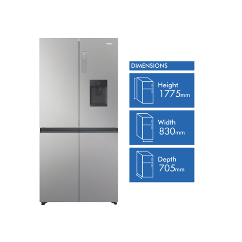 Bring everyday convenience to your kitchen with the spacious Haier 508L Quad Door Refrigerator. This large-capacity fridge offers ample storage for the weekly shop and boasts smart features to keep food fresher for longer. The water dispenser provides cool filtered water without plumbing required. Flexible storage options like the SwitchZone compartment and Humidity Fresh Zone create a customisable fridge interior to suit your needs. Multi-zone air cooling maintains an even temperature throughout so food stays fresher in any part of the fridge or freezer. Antibacterial protection ensures a hygienic interior. Set the holiday mode when you're away to save power and use the smart lock to keep little fingers out of your treats. With sleek silver styling this fridge adds a touch of modern style to your home. The Haier fridge measures 830mm W x 1775mm H x 705mm D. Backed by a 2 year manufacturer's warranty for peace of mind.