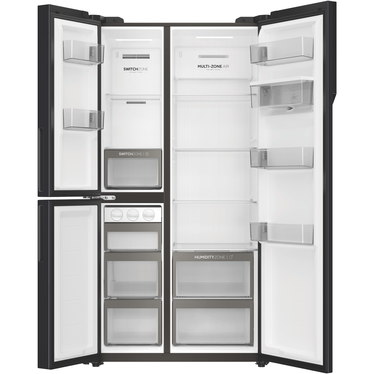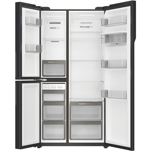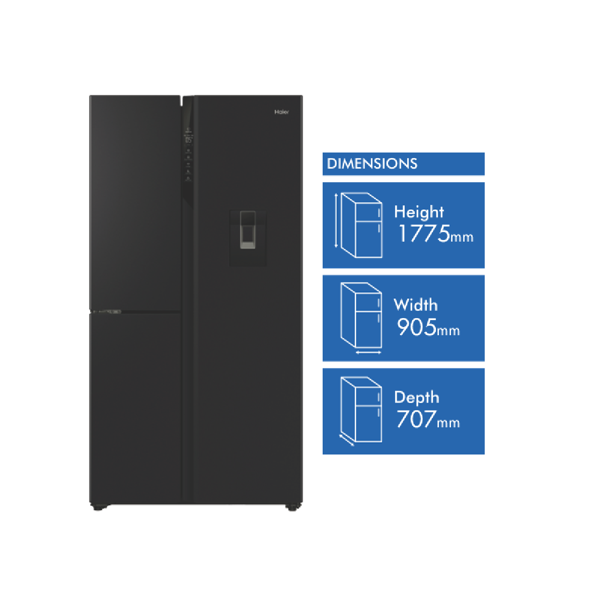 With 574 litres of spacious capacity this black Haier side by side fridge is the perfect fit for any family's needs. The HRF575XHC features a generous 385L fridge compartment an 86L freezer and 103L variable temperature compartment providing ample room to store all your fresh foods and frozen favorites. Dual doors give easy access to both fridge and freezer while the sleek black finish adds modern style to your kitchen. Stay hydrated with the convenient water dispenser that doesn't require plumbing. Multi-zone cooling and humidity control ensure optimum conditions for preserving food freshness and quality. Enjoy the flexibility to adjust fridge and freezer temperatures to suit your needs with the innovative Switch Zone feature. Rated 4 stars for energy efficiency this fridge helps lower your energy bills while still providing outstanding refrigeration performance. Backed by Haier's 2 year warranty for added peace of mind. With stylish looks family-sized capacity and handy features like the water dispenser this Haier side by side fridge makes refrigerator convenience a breeze. The manufacturer's part number for this product is HRF575XHC. Seize the savings and purchase this exceptional fridge today!