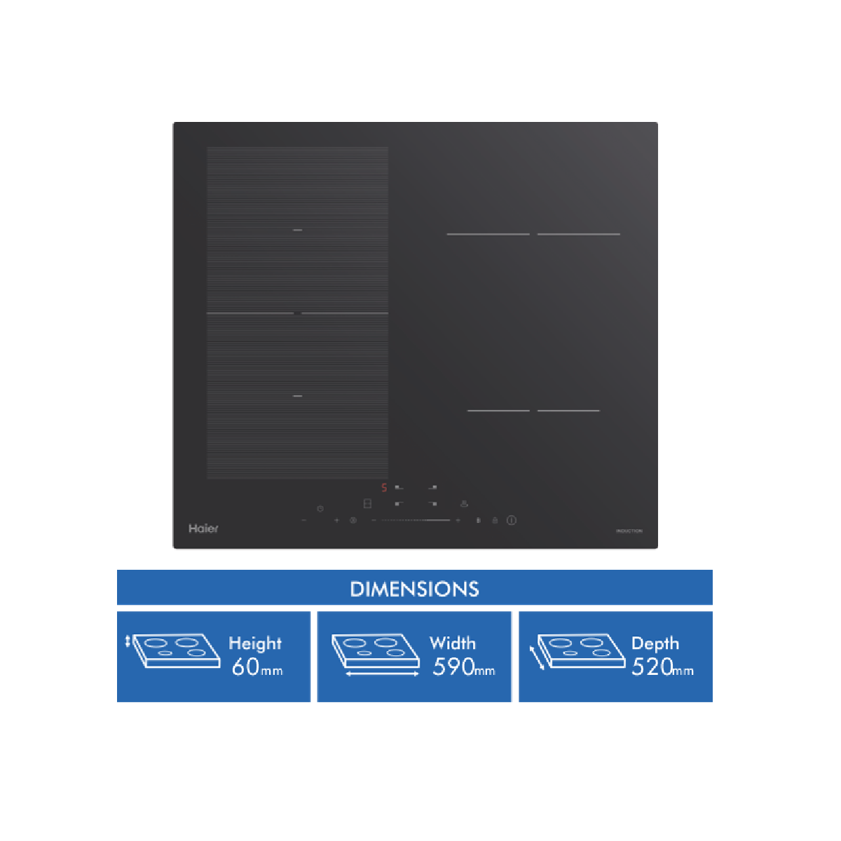 This Haier 60cm Induction Cooktop HCI604FTB3 has 4 cooking zones adding special Flexi Zones that allow two zones to pair together for a massive surface area. It has 9 power level settings along with Power Boost that quickly reaches up to 2800w of high temperature time critical cooking. It has a timer along with a child safety lock and residual heat indicators. Take charge with an array of control options with touch and slide controls and cook with efficiency and precision with help from this Haier cooktop.