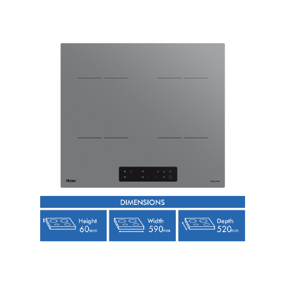 This sleek and stylish Haier 60cm induction cooktop brings instant-response heating and precise temperature control to busy kitchens. With its smooth grey glass surface and modern touch controls it will complement any décor. The four induction cooking zones allow for flexible placement of pans. There are 9 power levels to choose from plus a boost function for intense heat when you need it. Features like the timer child lock and automatic safety switch off provide added peace of mind. Instant-response heating means no more waiting around for elements to heat up. The induction technology is highly energy-efficient. With a width of 590mm and depth of 520mm this cooktop provides ample cooking space while maintaining a slimline profile. The glass surface simply wipes clean after use. Backed by Haier's 2 year warranty this induction cooktop delivers exceptional performance safety and style. The manufacturer's part number for this product is HCI604TG3. This Haier induction cooktop will make meal prep fast and fuss-free.