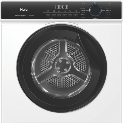 Dry clothes efficiently and conveniently with the Haier 6kg Vented Dryer. This wall-mountable white clothes dryer features a generous 6kg drying capacity and 15 programs including Air Dry Bedding Cottons Delicate Durable Express 30 Mixed Synthetics Time Dry and Towels so you can select the perfect cycle for each load. With auto-sensing technology anti-crease function and adjustable dryness levels this dryer takes the guesswork out of drying for optimized results. Mounting and stacking kits allow flexible installation. The easy access lint filter and keylock add convenience. With front and rear venting options this Haier clothes dryer can fit into any space. Backed by a 2 year manufacturer's warranty for peace of mind. The HDV60AWW1 is the manufacturer's part number for this dryer.